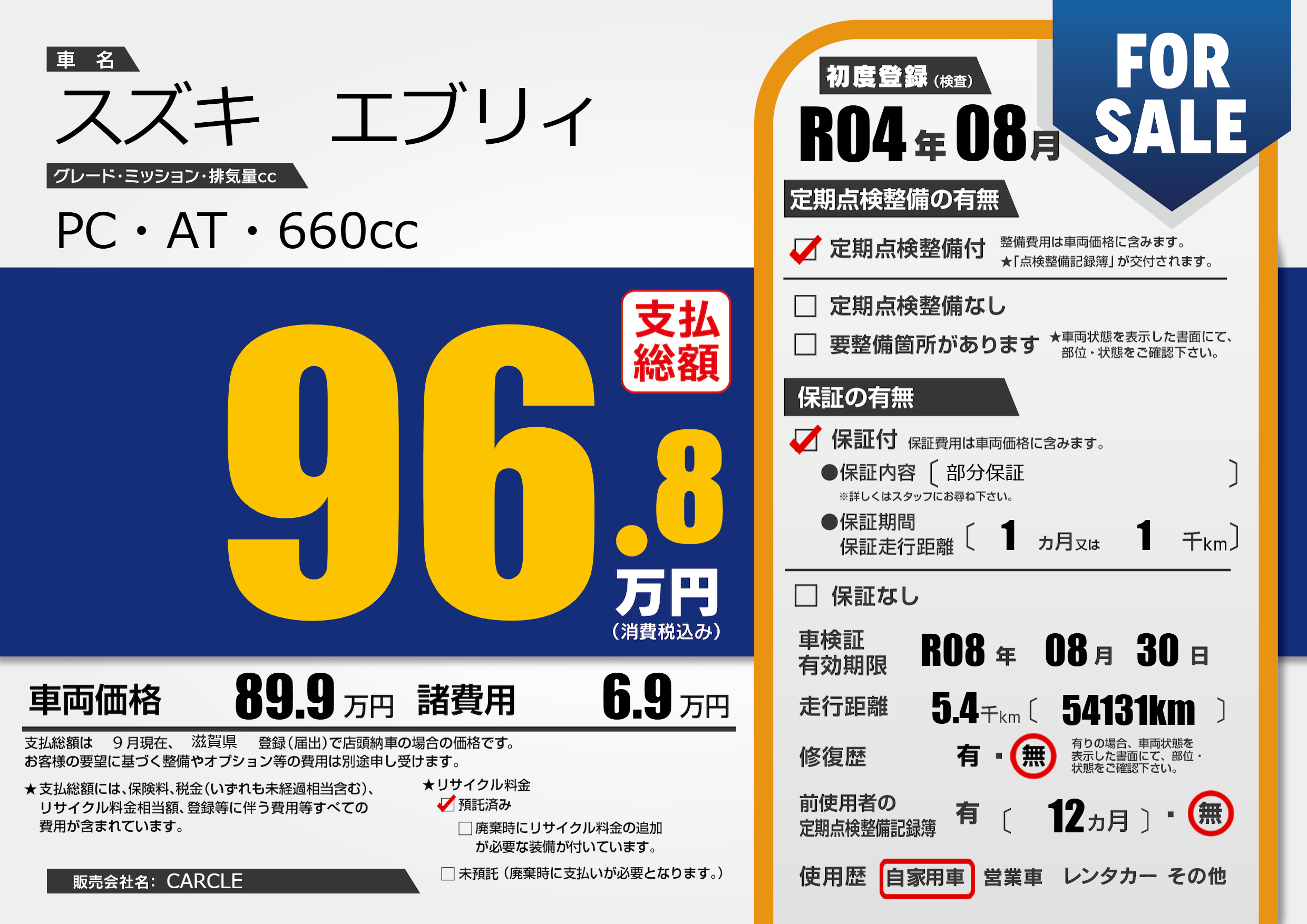 | 走行キロ | 0.5万km | 初年度登録 | R04年08月 |