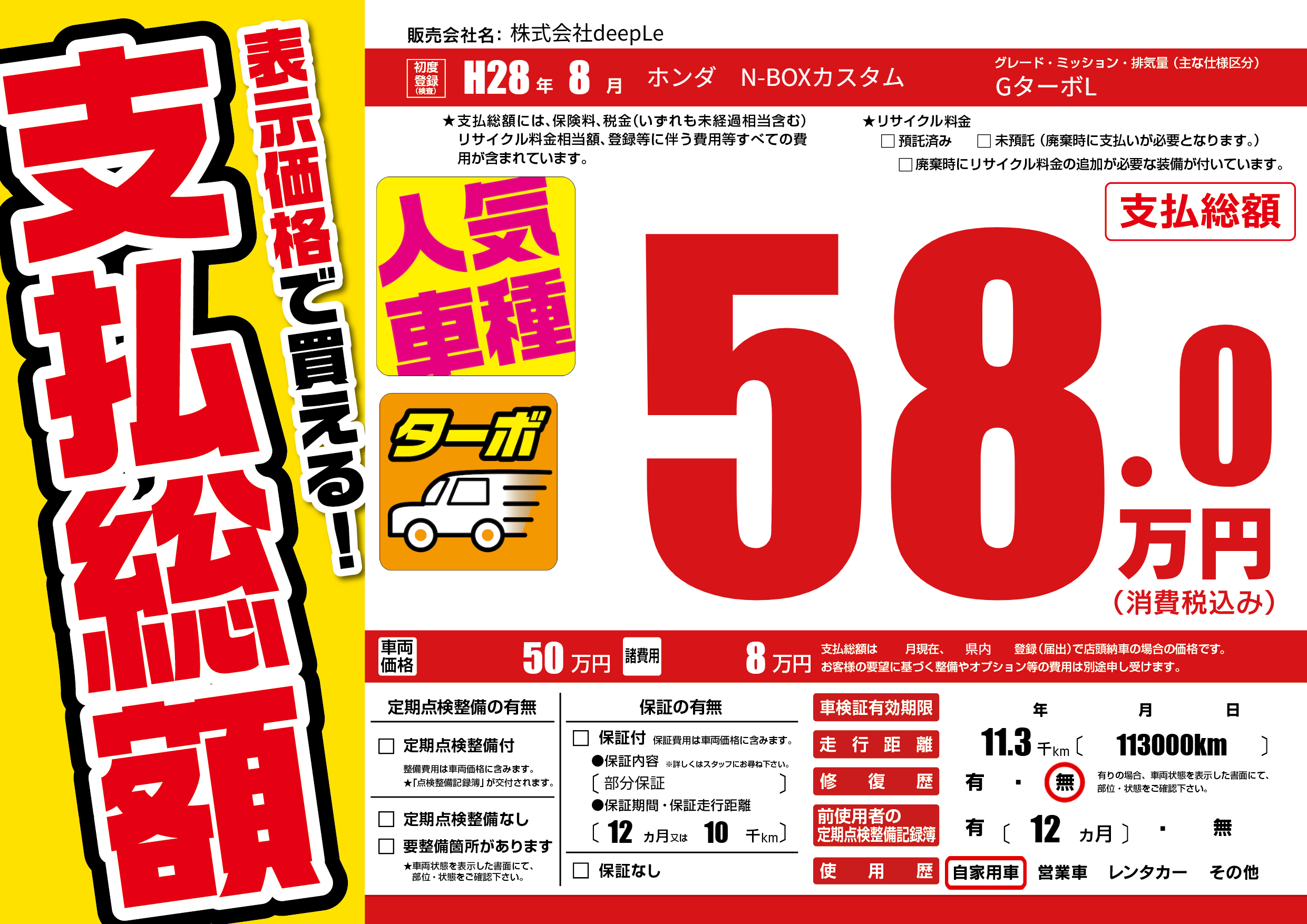 | 車名 | ホンダ N-BOXカスタム | グレード ミッション 排気量 |