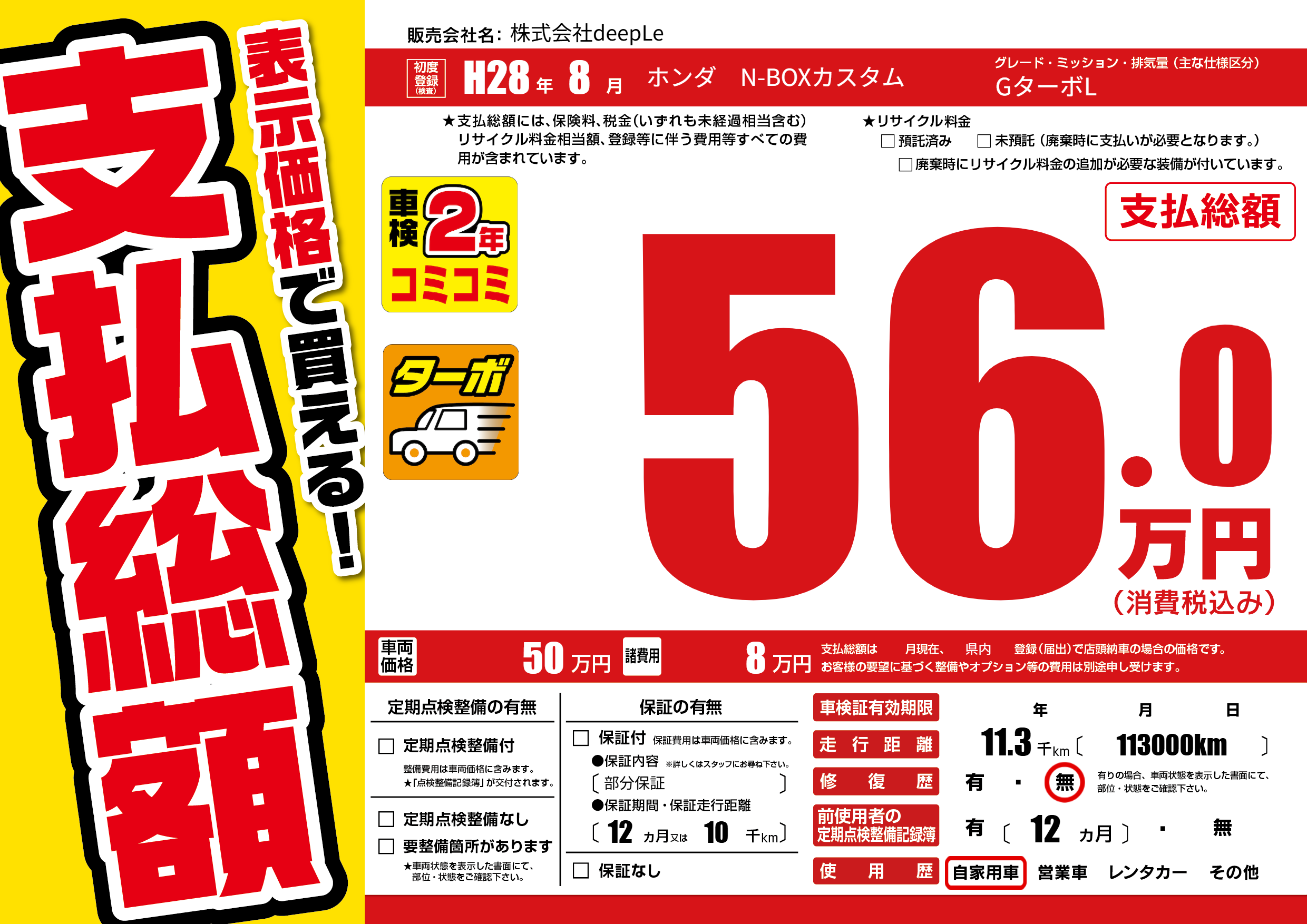 | 走行キロ | 1.1万km | 初年度登録 | H28年8月 |