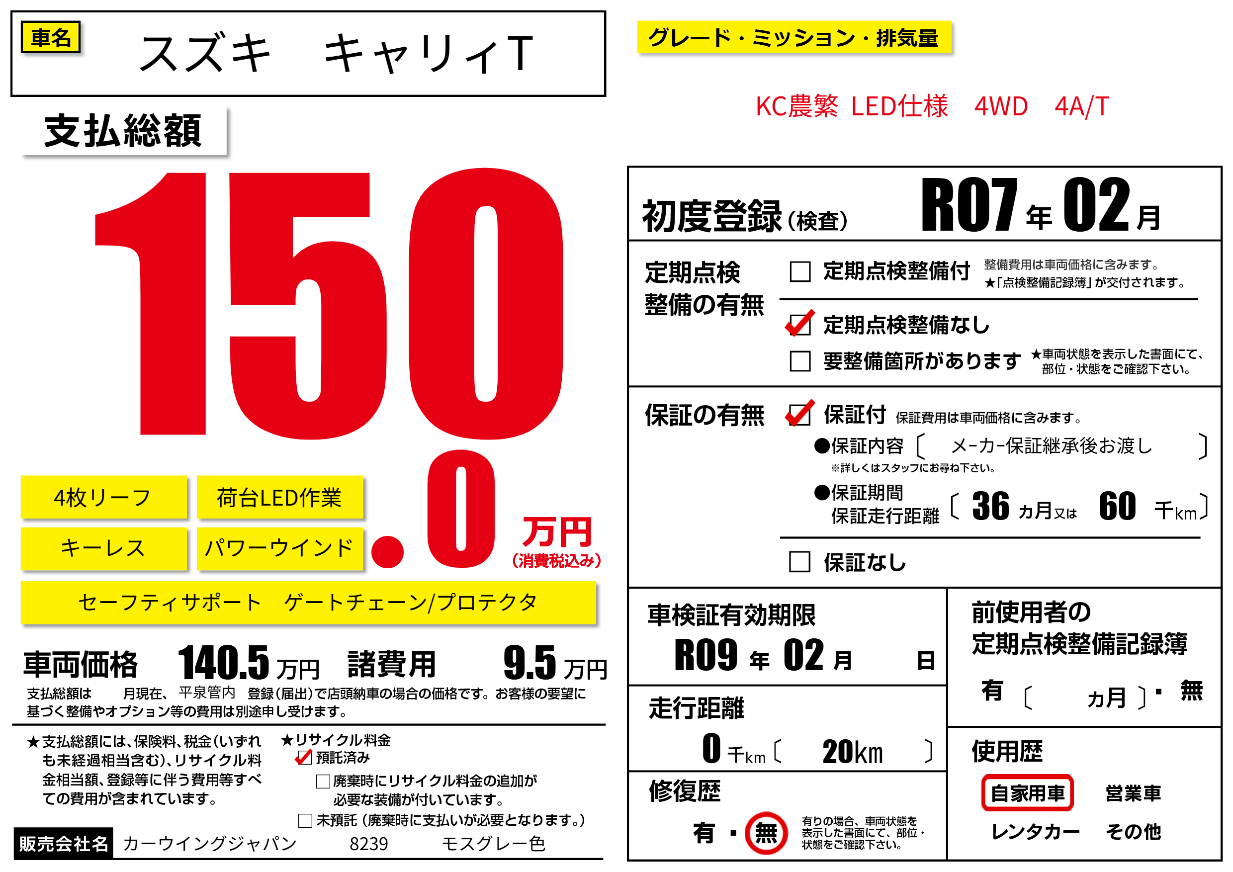 | 走行キロ | - | 初年度登録 | R07年02月 |