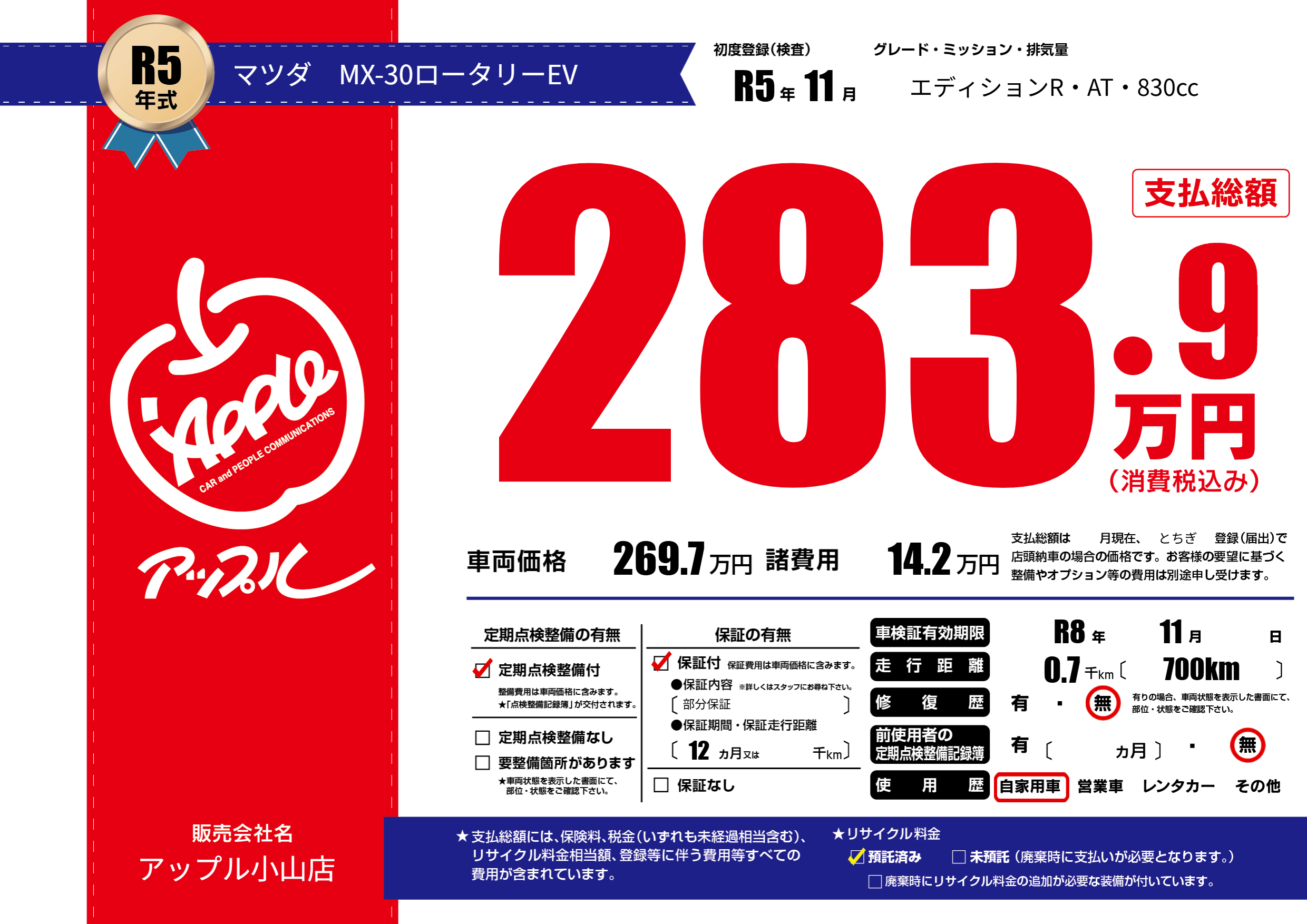 | 車名 | マツダ MX-30ロータリーEV | グレード ミッション 排気量 |