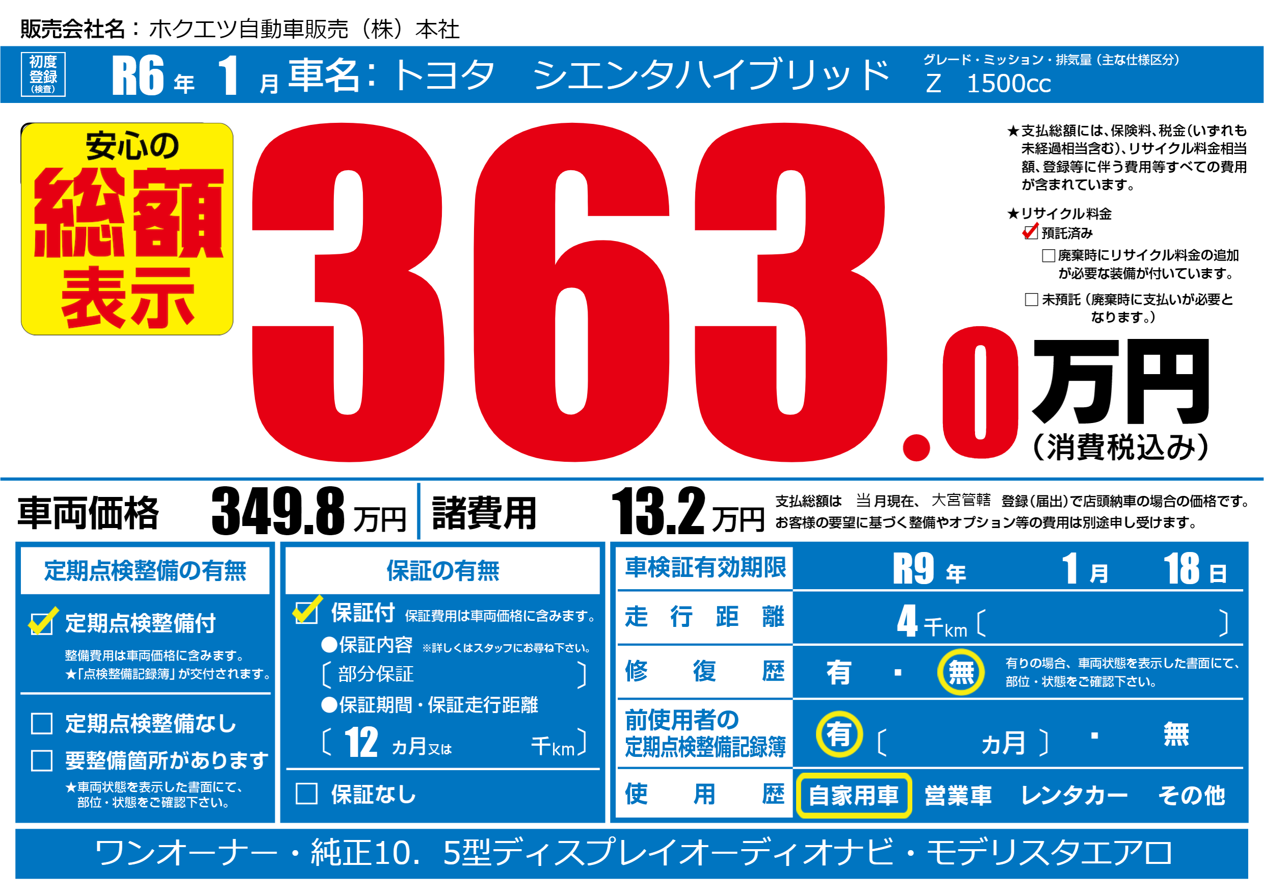 | 車名 | トヨタ シエンタハイブリッド | グレード ミッション 排気量 |