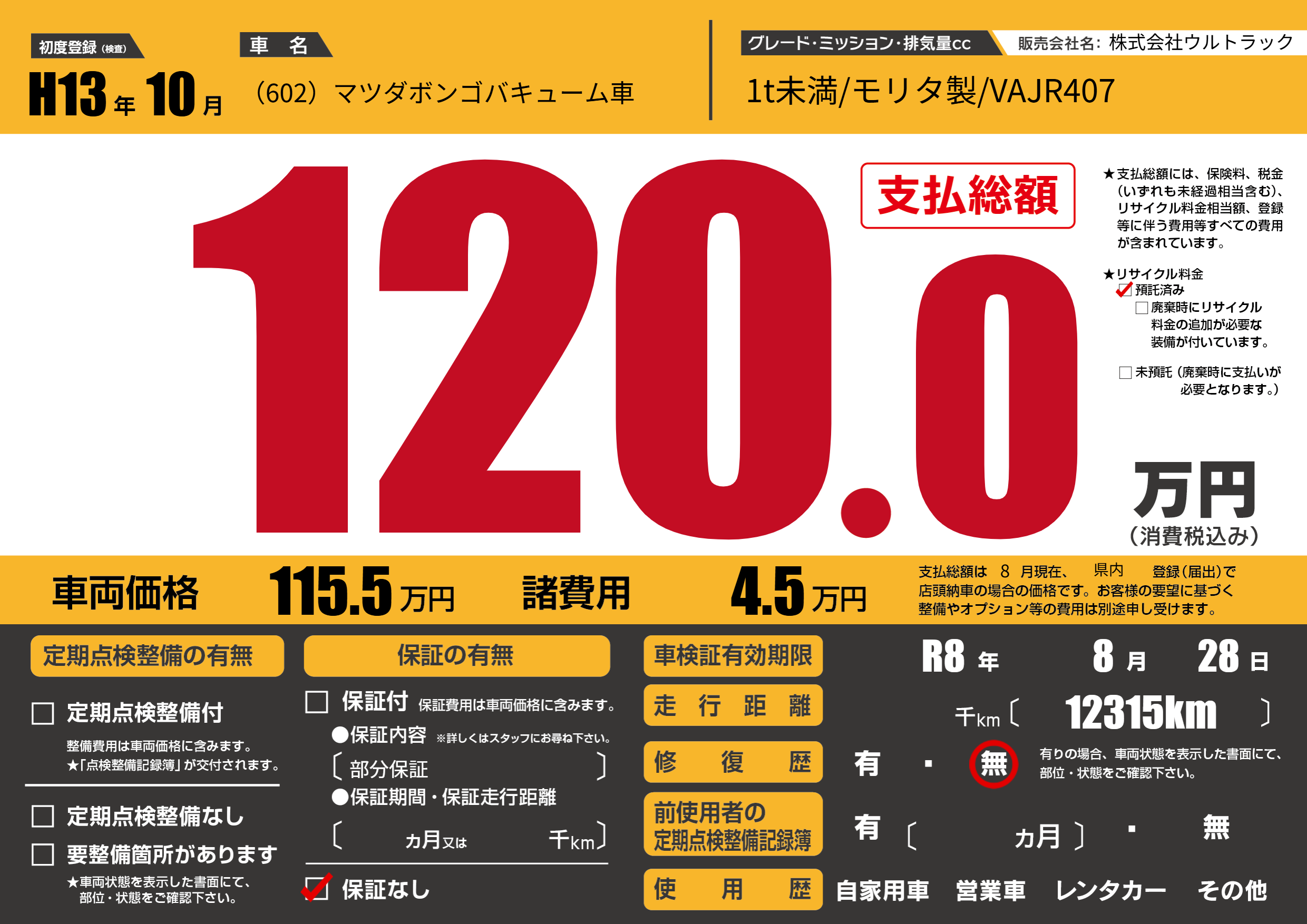 | 車名 | (602)マツダボンゴバキューム車 | グレード ミッション 排気量 |
