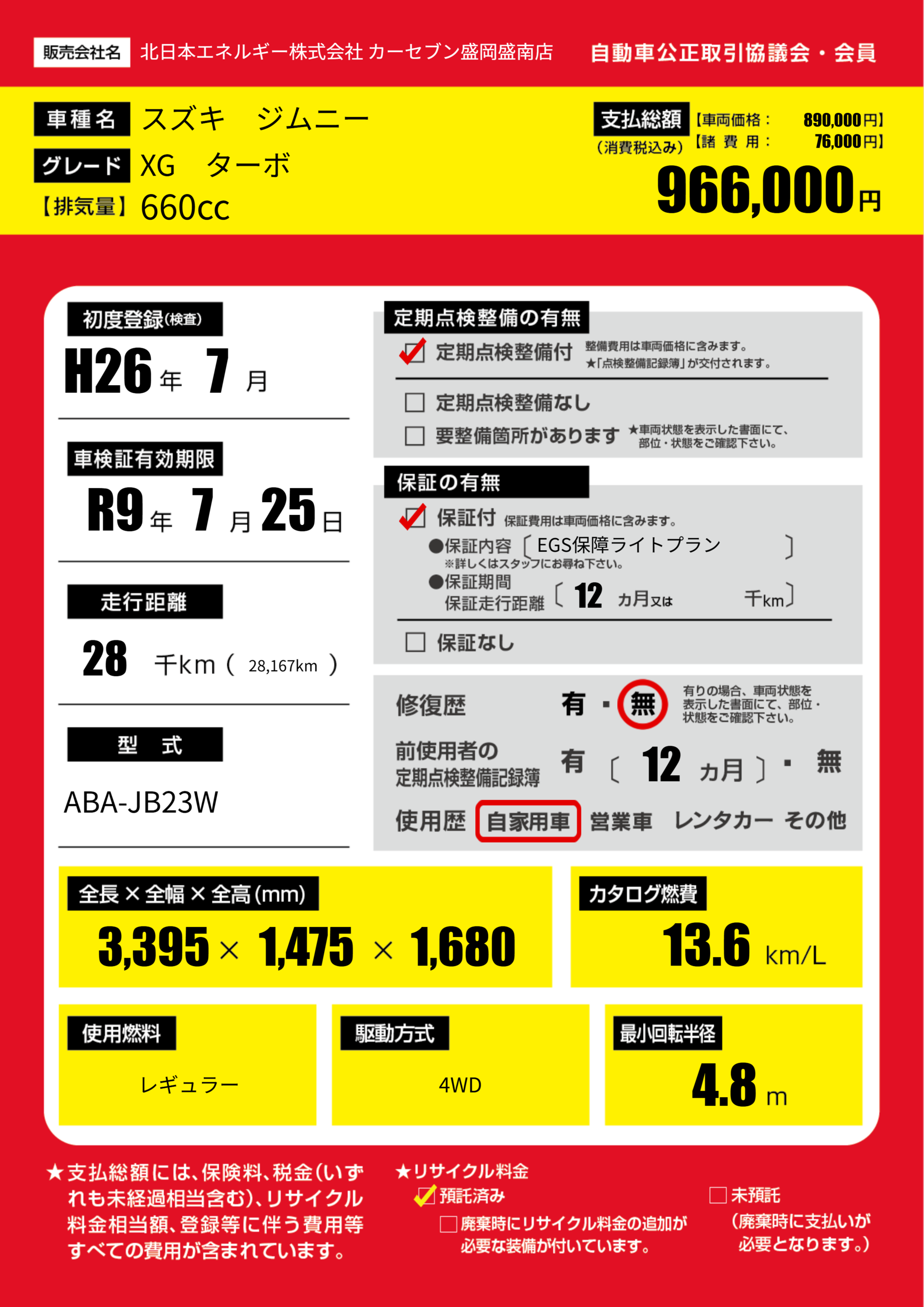 | 車名 | スズキ ジムニー | グレード ミッション 排気量 |