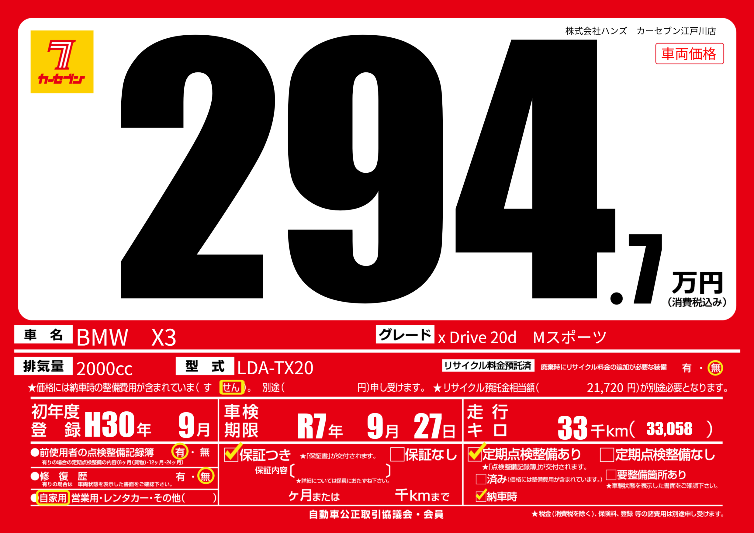 | 車名 | BMW X3 | グレード ミッション 排気量 |
