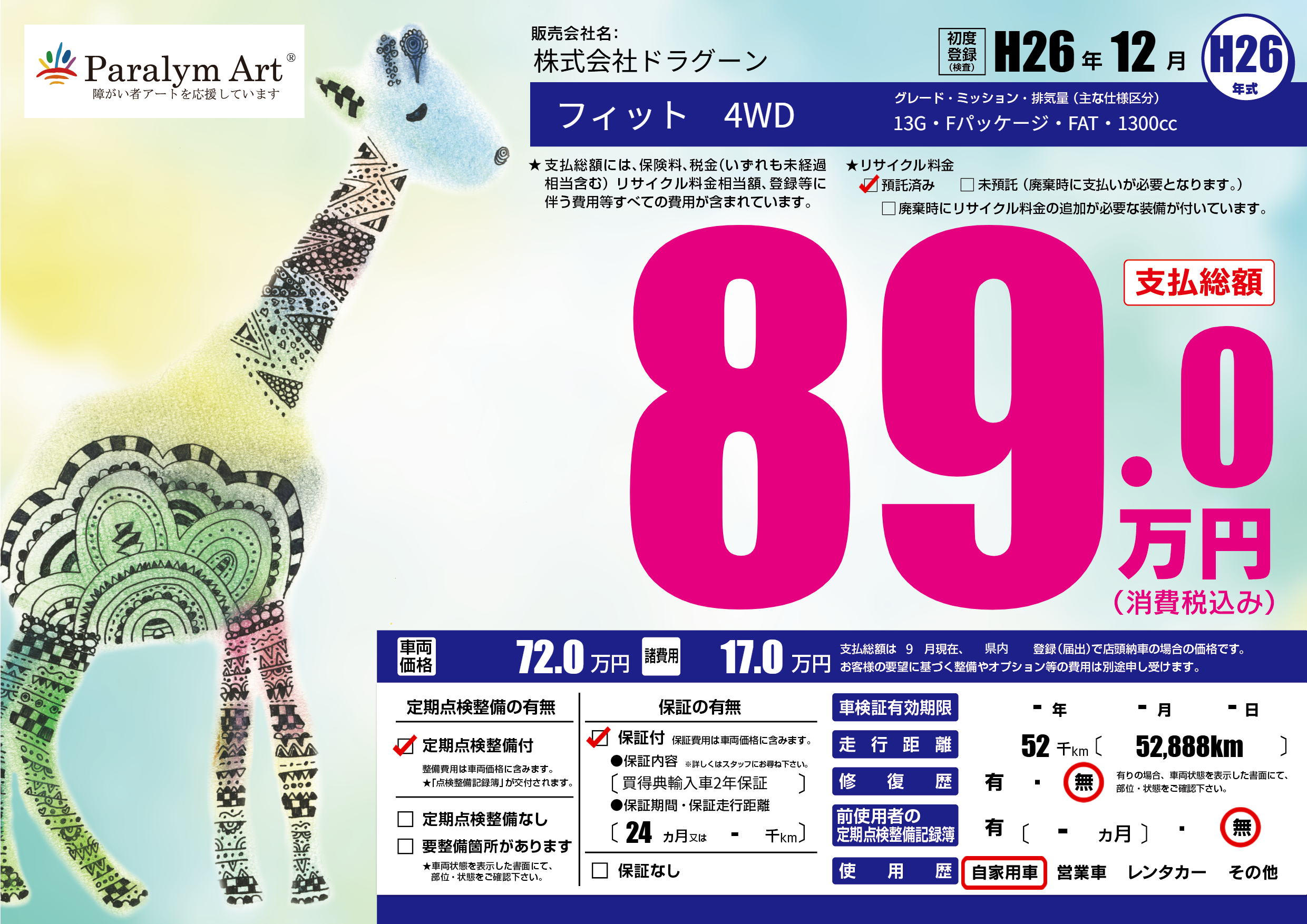 | 車名 | フィット 4WD | グレード ミッション 排気量 |