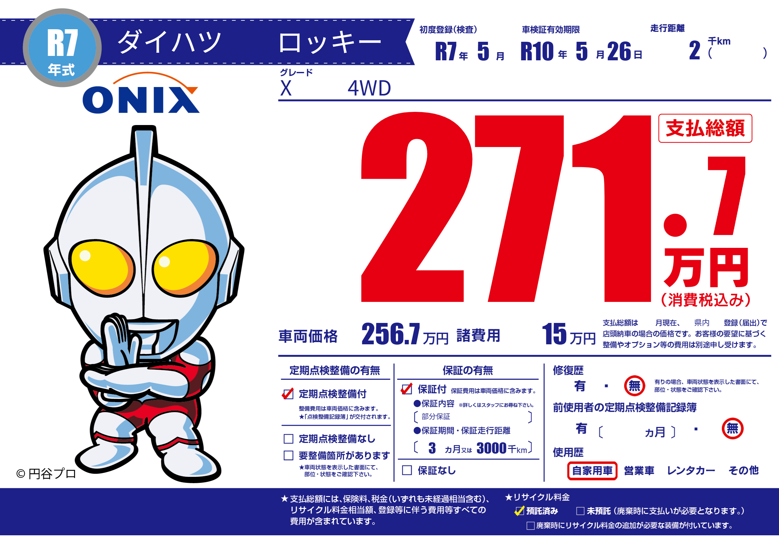 | 走行キロ | 0.2万km | 初年度登録 | R7年5月 |