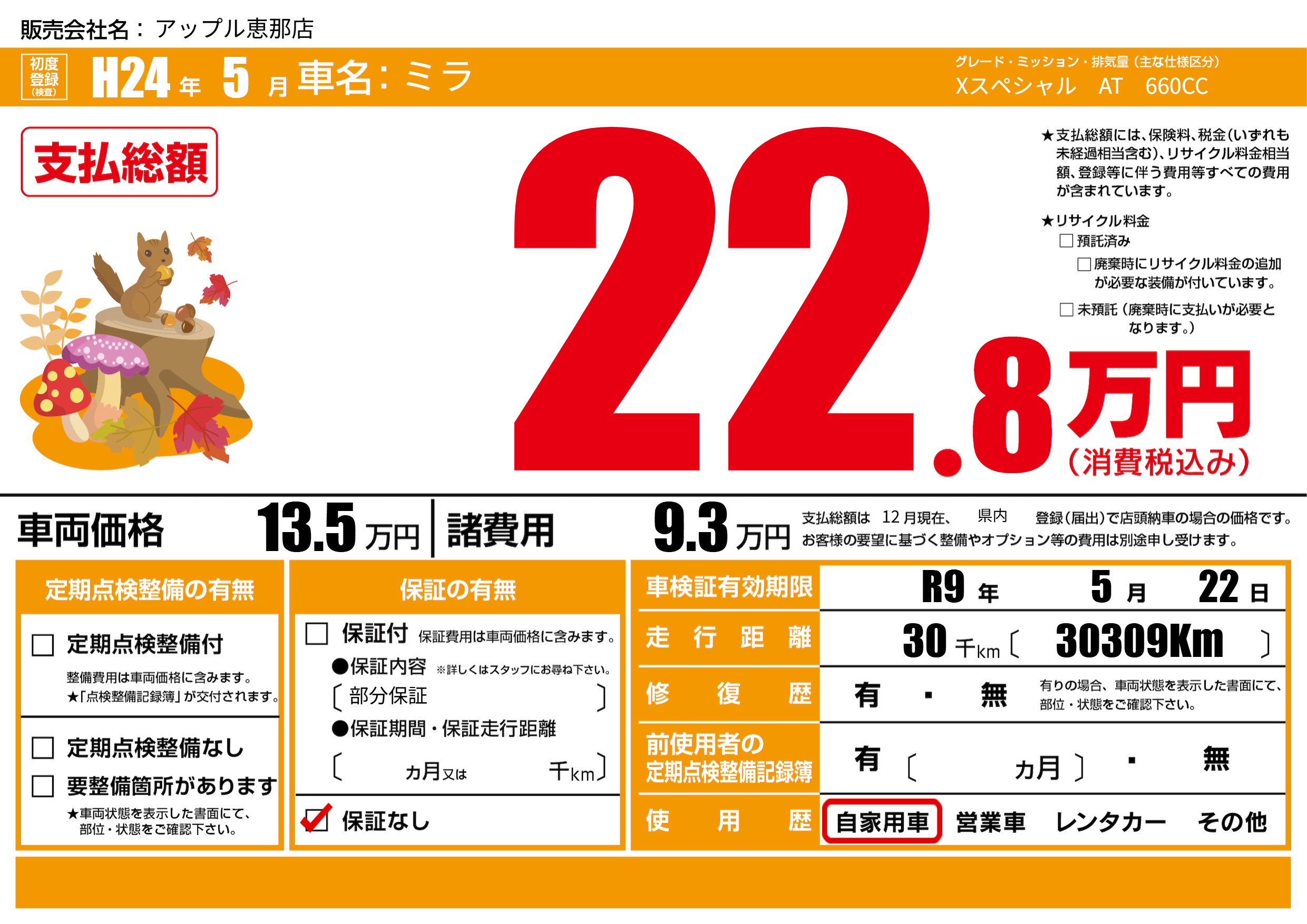 | 走行キロ | 3万km | 初年度登録 | H24年5月 |