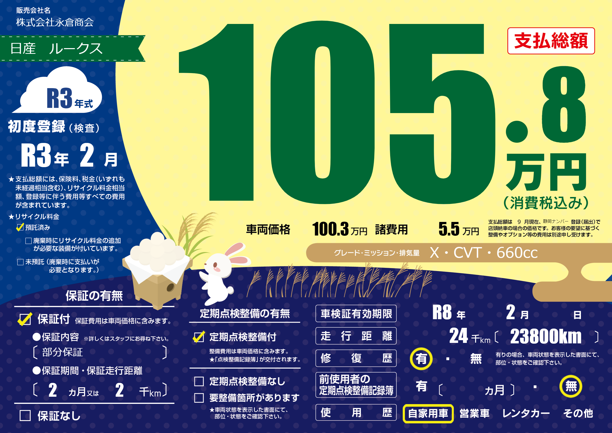 | 車名 | 日産 ルークス | グレード ミッション 排気量 |