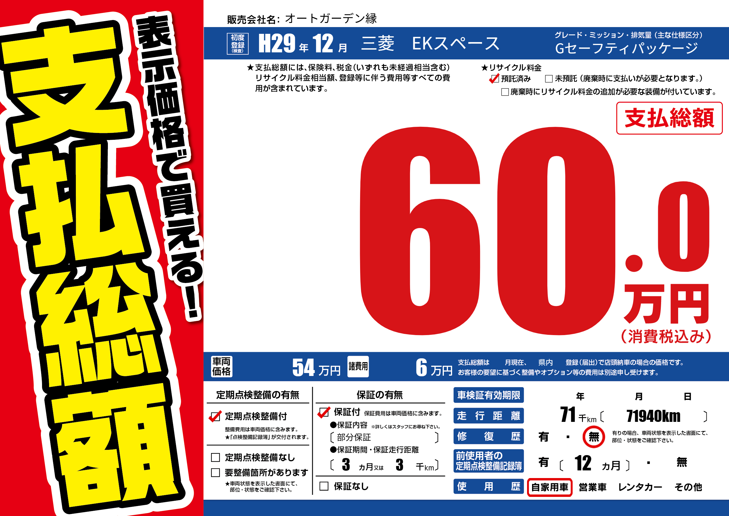 | 車名 | 三菱 EKスペース | グレード ミッション 排気量 |