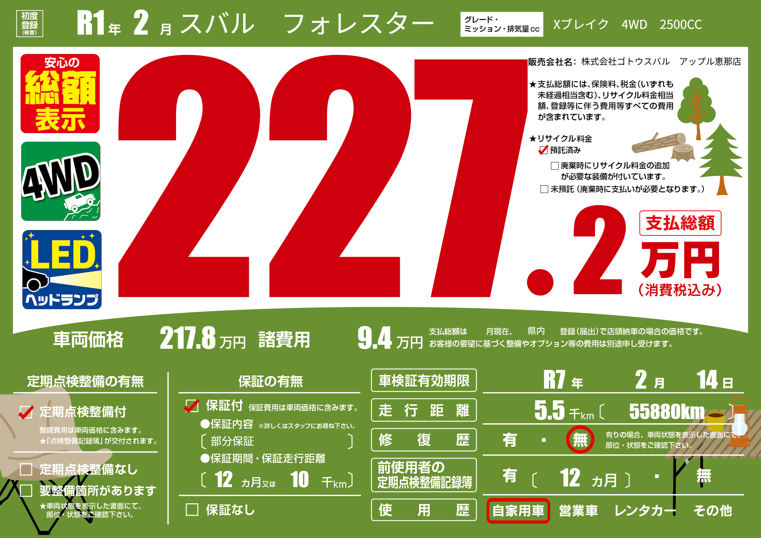 | 車名 | スバル フォレスター | グレード ミッション 排気量 |