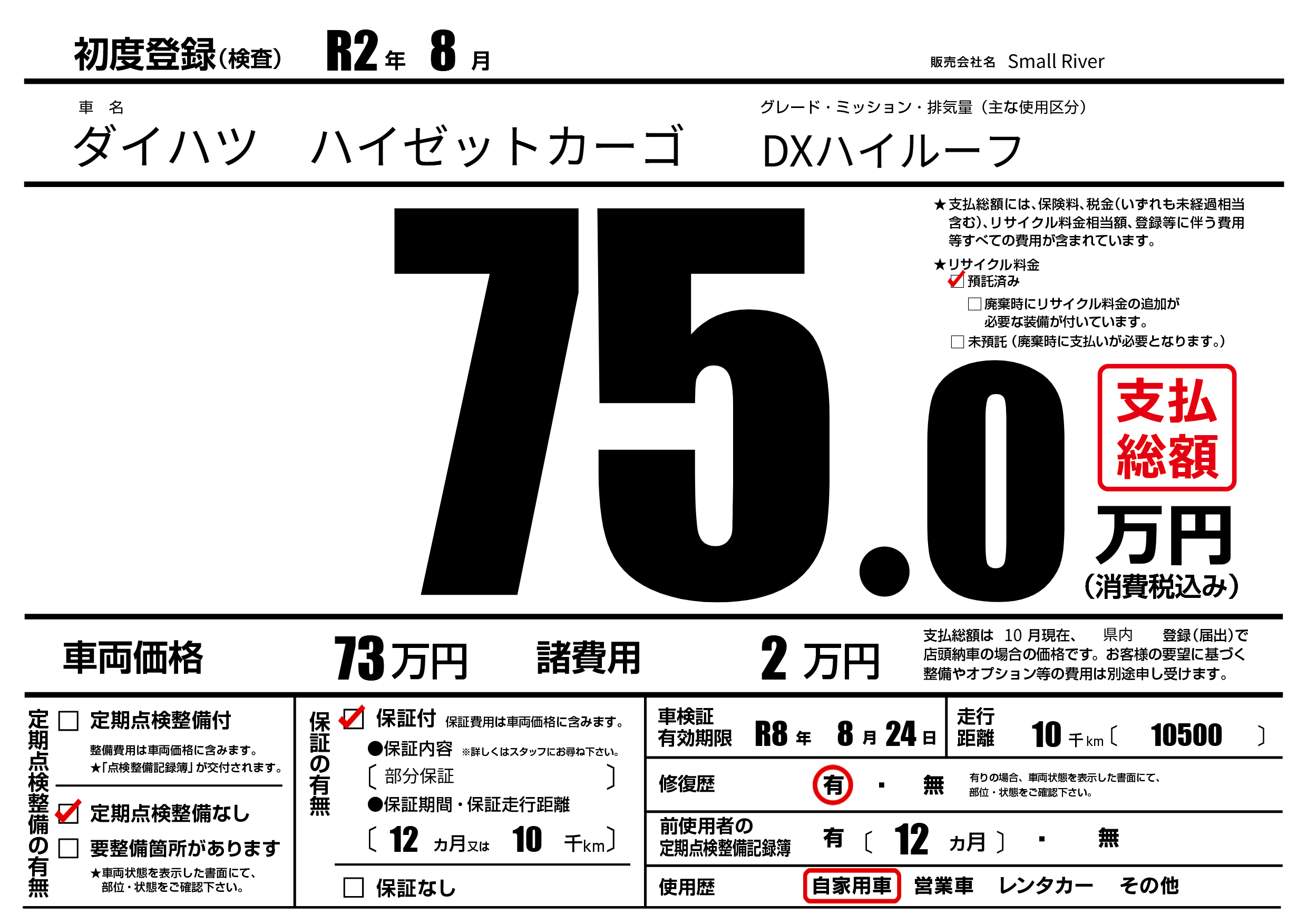 | 走行キロ | 1万km | 初年度登録 | R2年8月 |