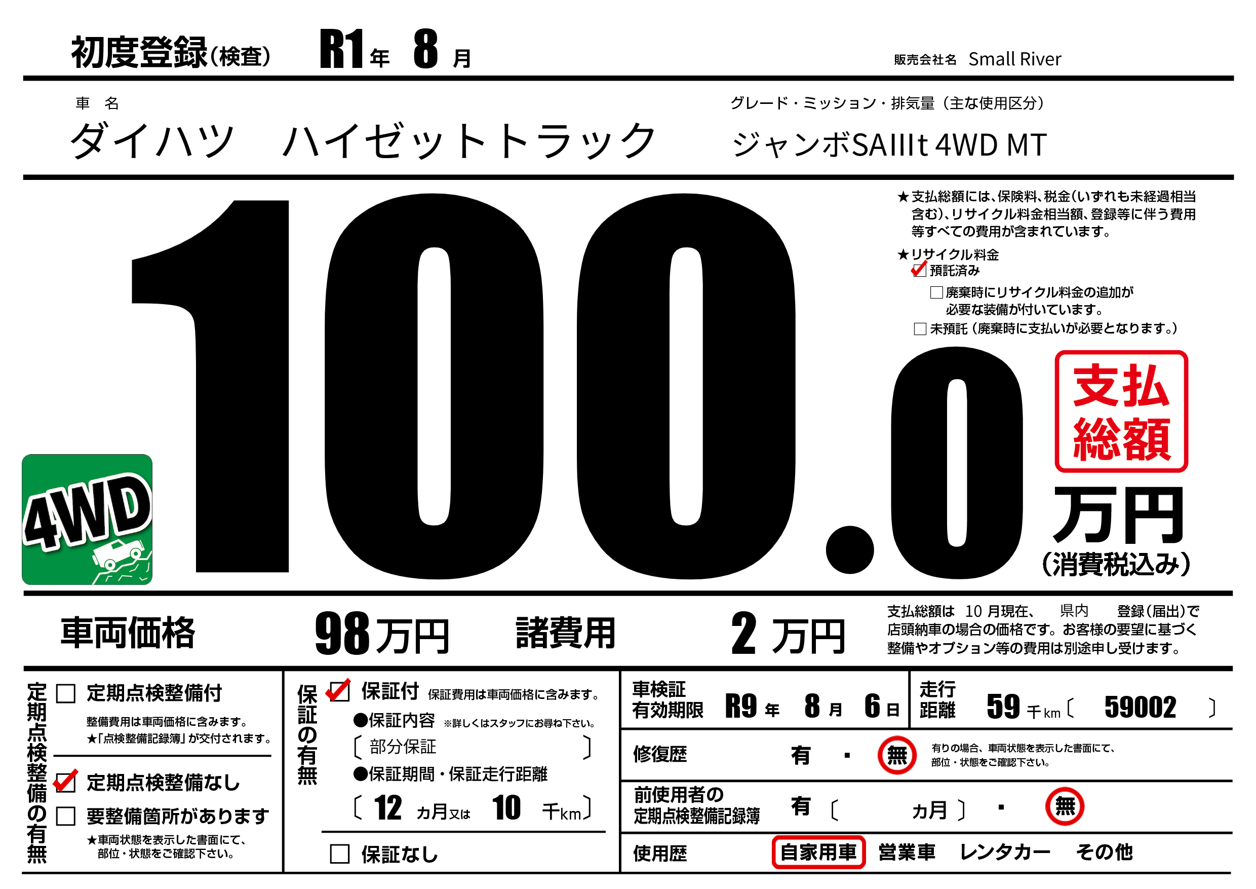 | 車名 | ダイハツ ハイゼットトラック | グレード ミッション 排気量 |