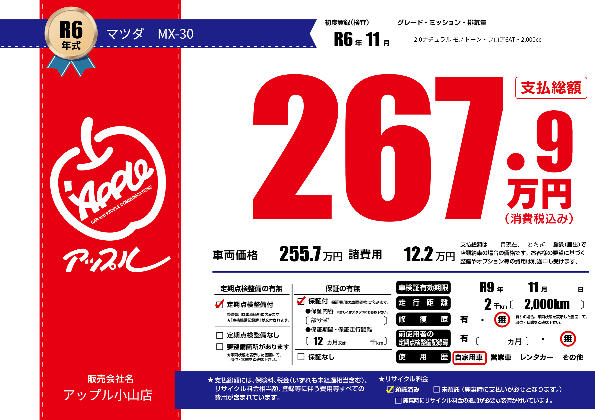 | 車名 | マツダ MX-30 | グレード ミッション 排気量 |