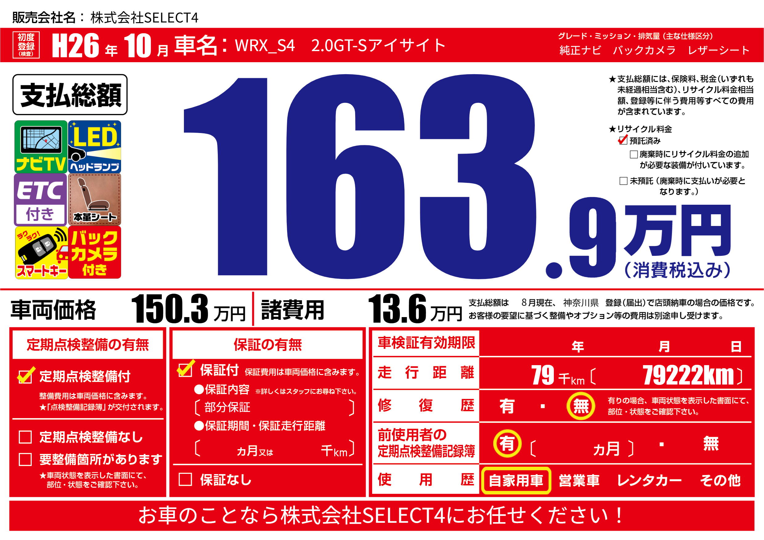 | 車名 | WRX_S4 2.0GT-Sアイサイト | グレード ミッション 排気量 |
