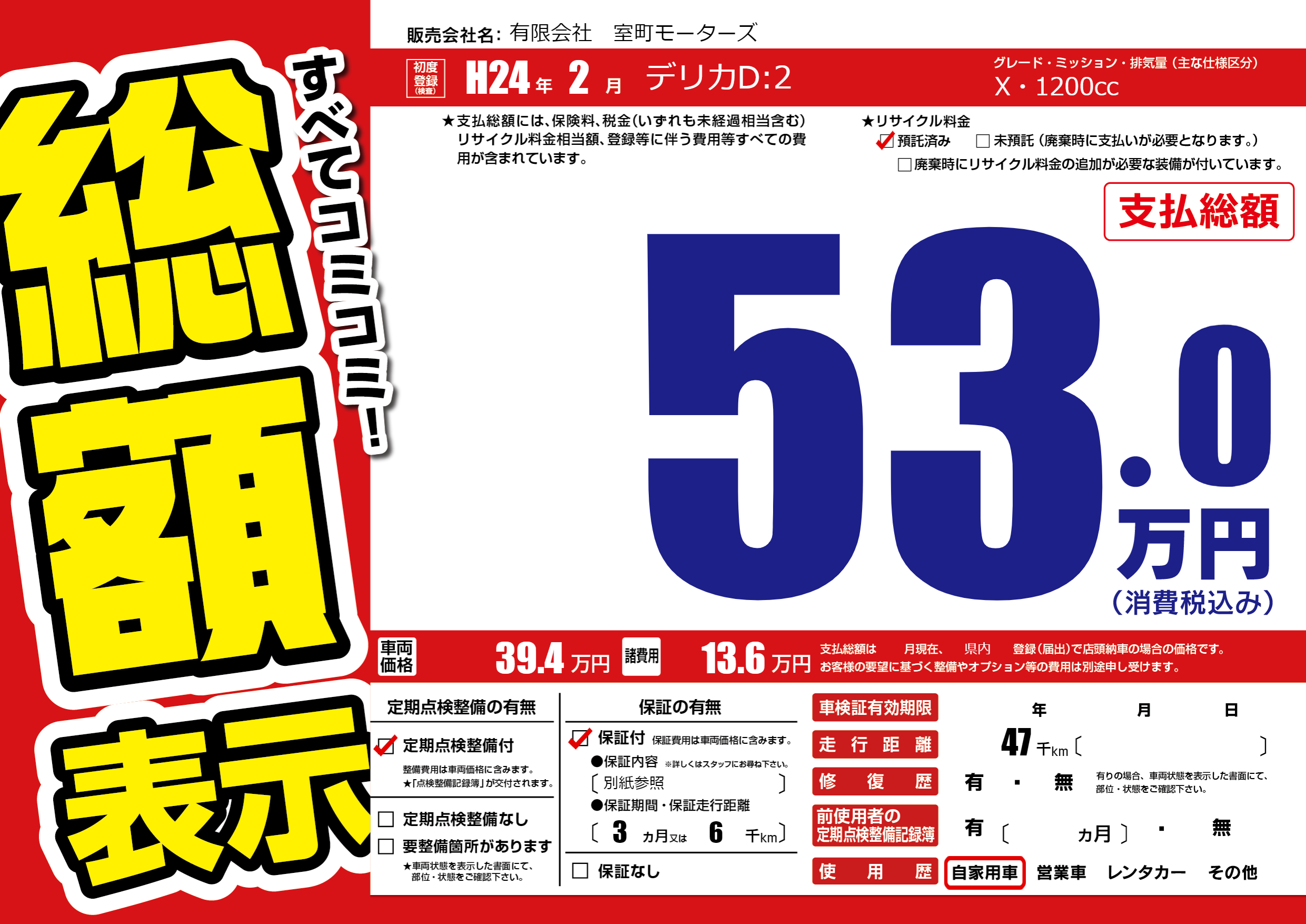 | 走行キロ | 4.7万km | 初年度登録 | H24年2月 |