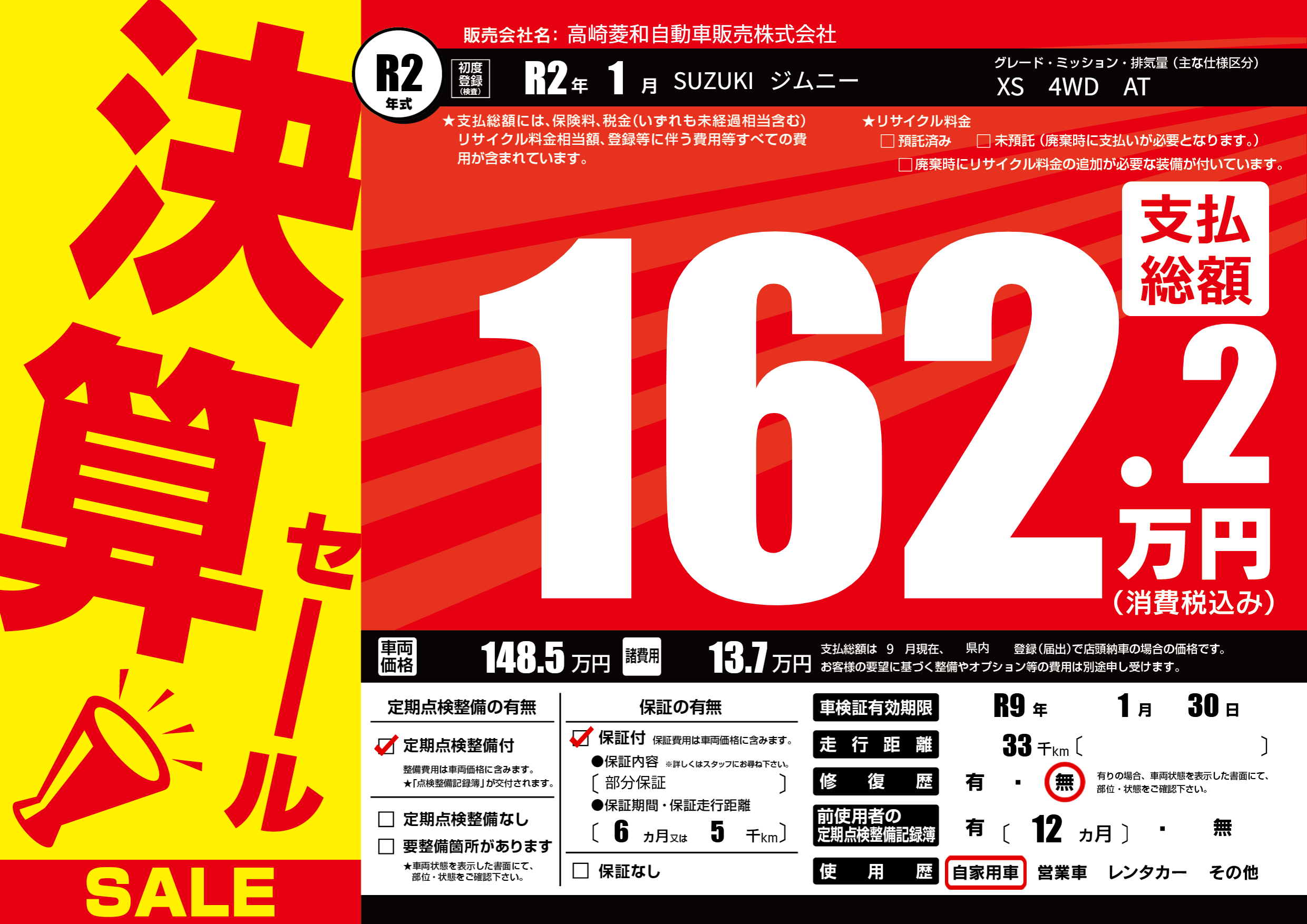 | 走行キロ | 3.3万km | 初年度登録 | R2年1月 |
