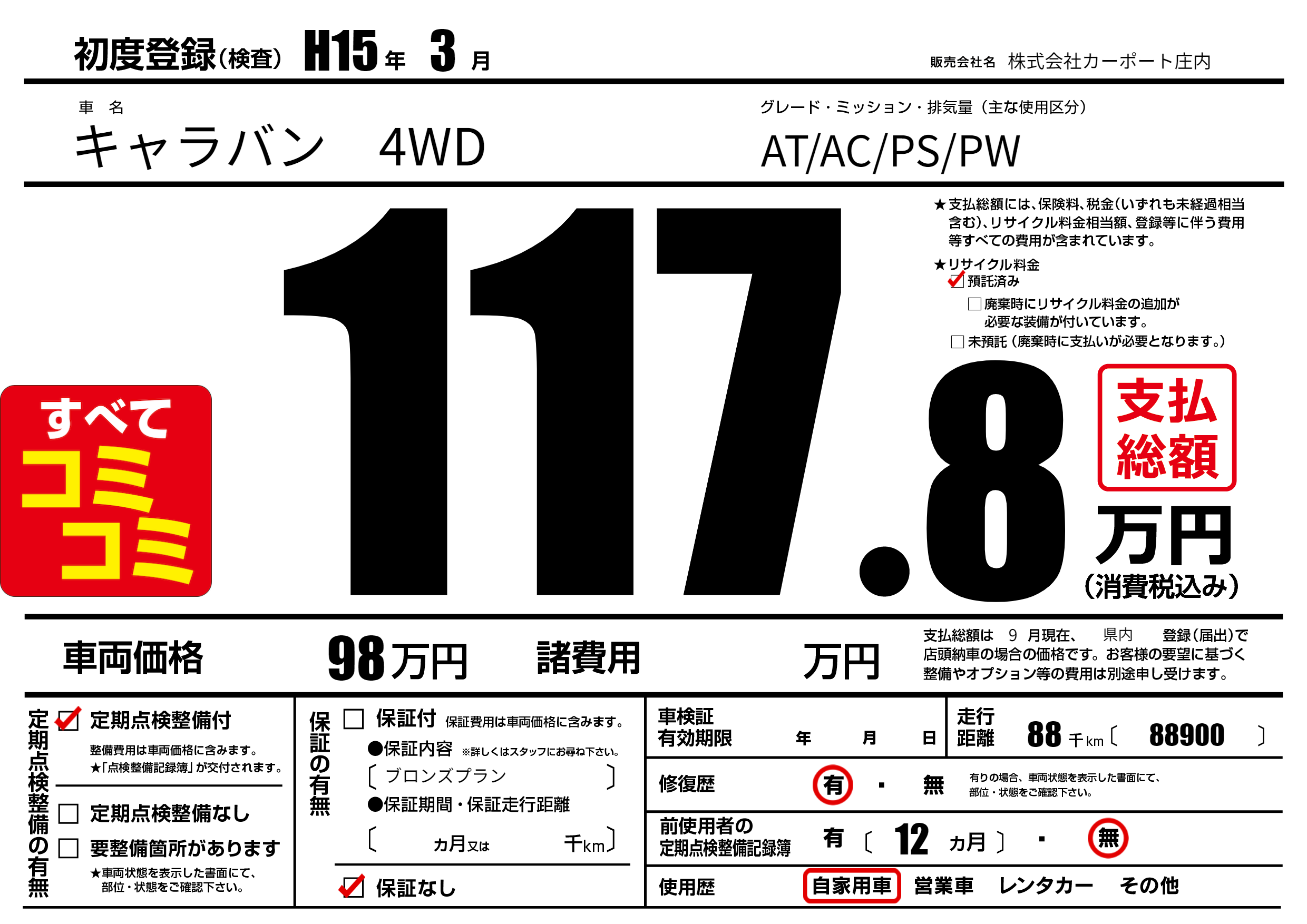 | 車名 | キャラバン 4WD | グレード ミッション 排気量 |