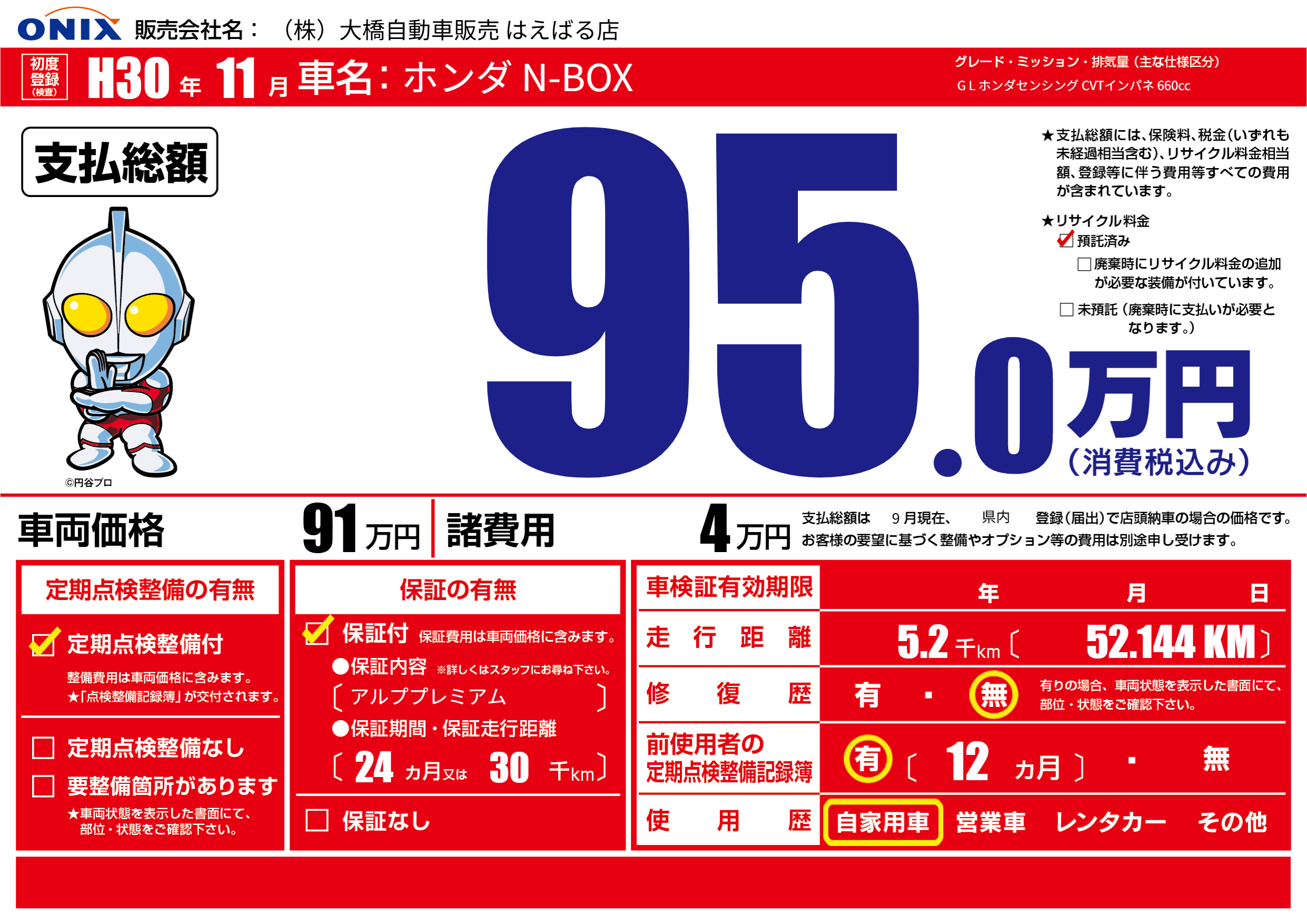 | 車名 | ホンダ N-BOX | グレード ミッション 排気量 |