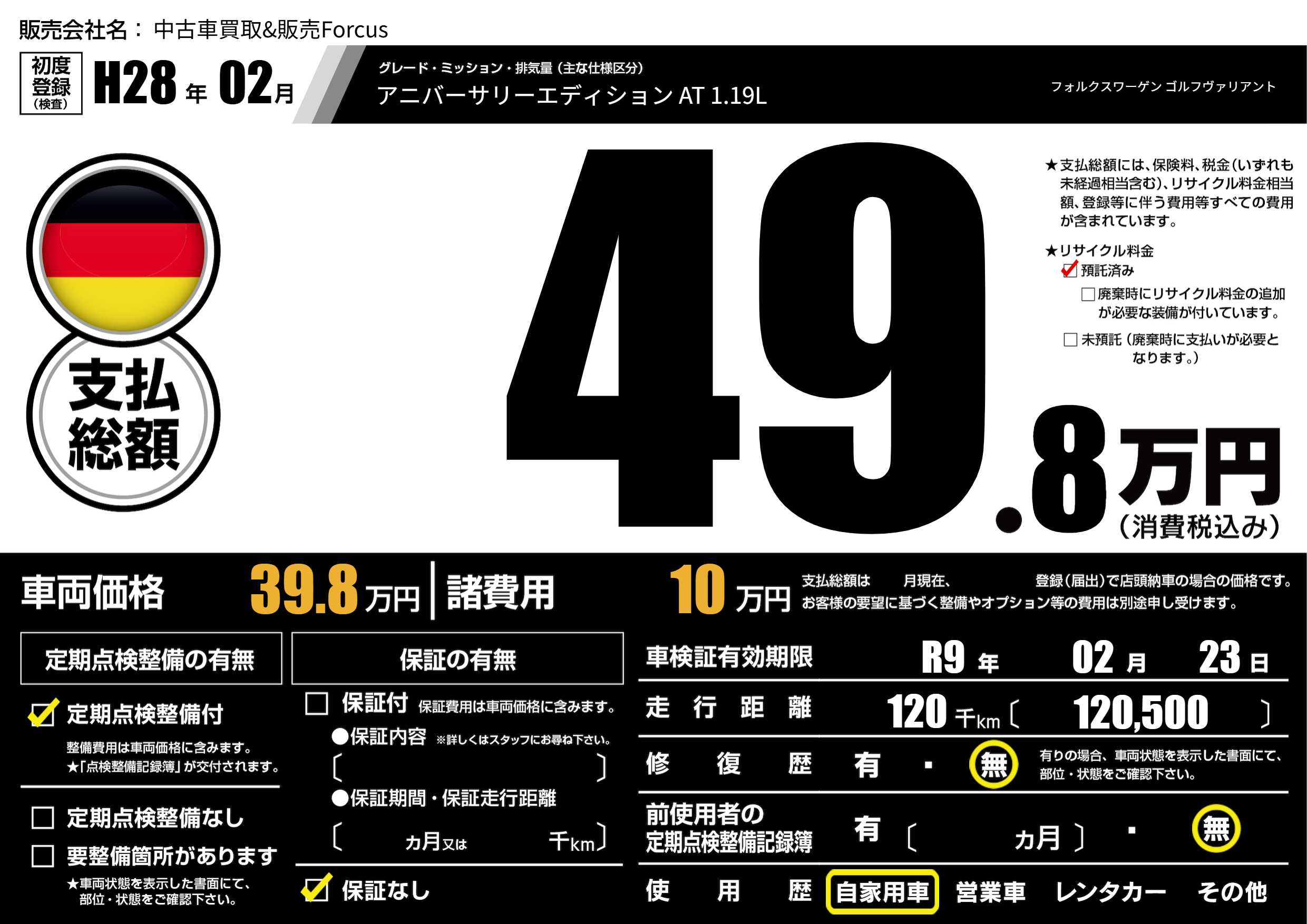 | 車名 | フォルクスワーゲン ゴルフヴァリアント | グレード ミッション 排気量 |