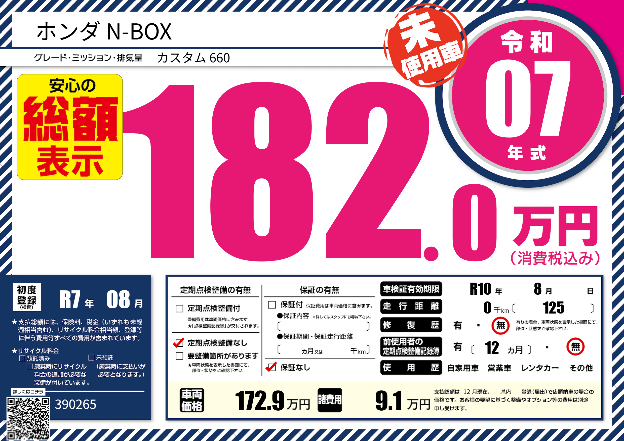 | 走行キロ | - | 初年度登録 | R7年08月 |