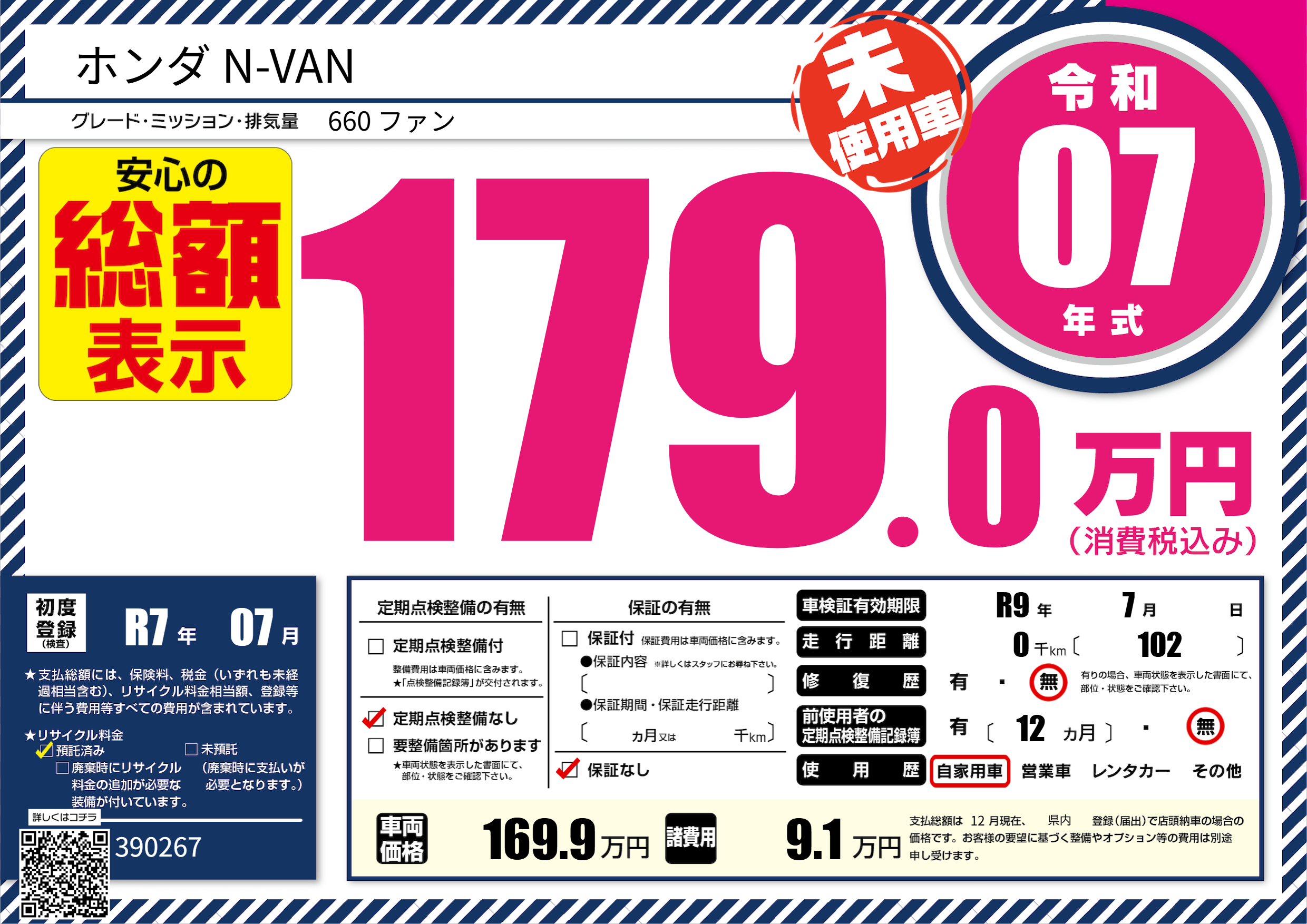 | 走行キロ | - | 初年度登録 | R7年07月 |