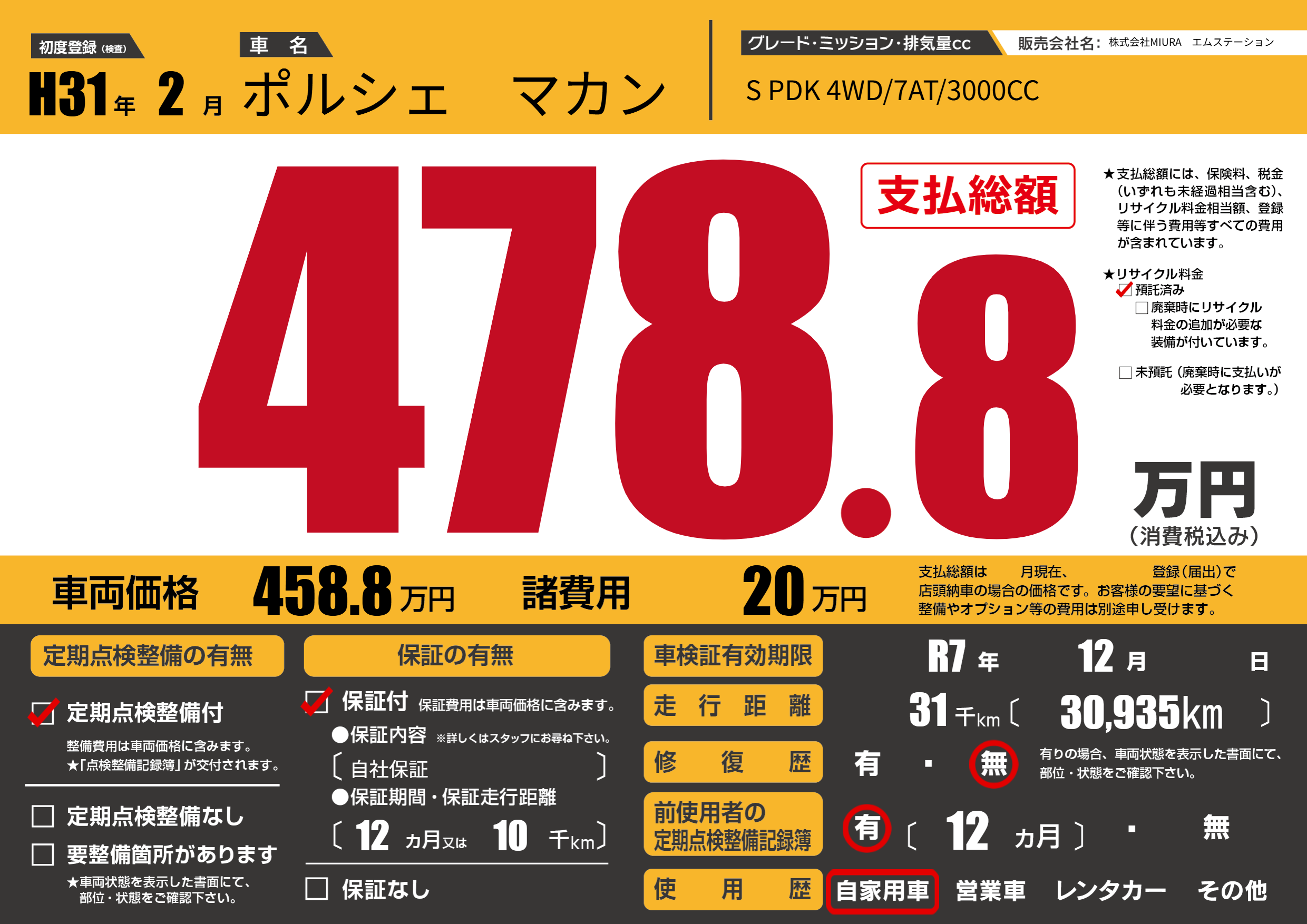 | 走行キロ | 3.1万km | 初年度登録 | H31年2月 |