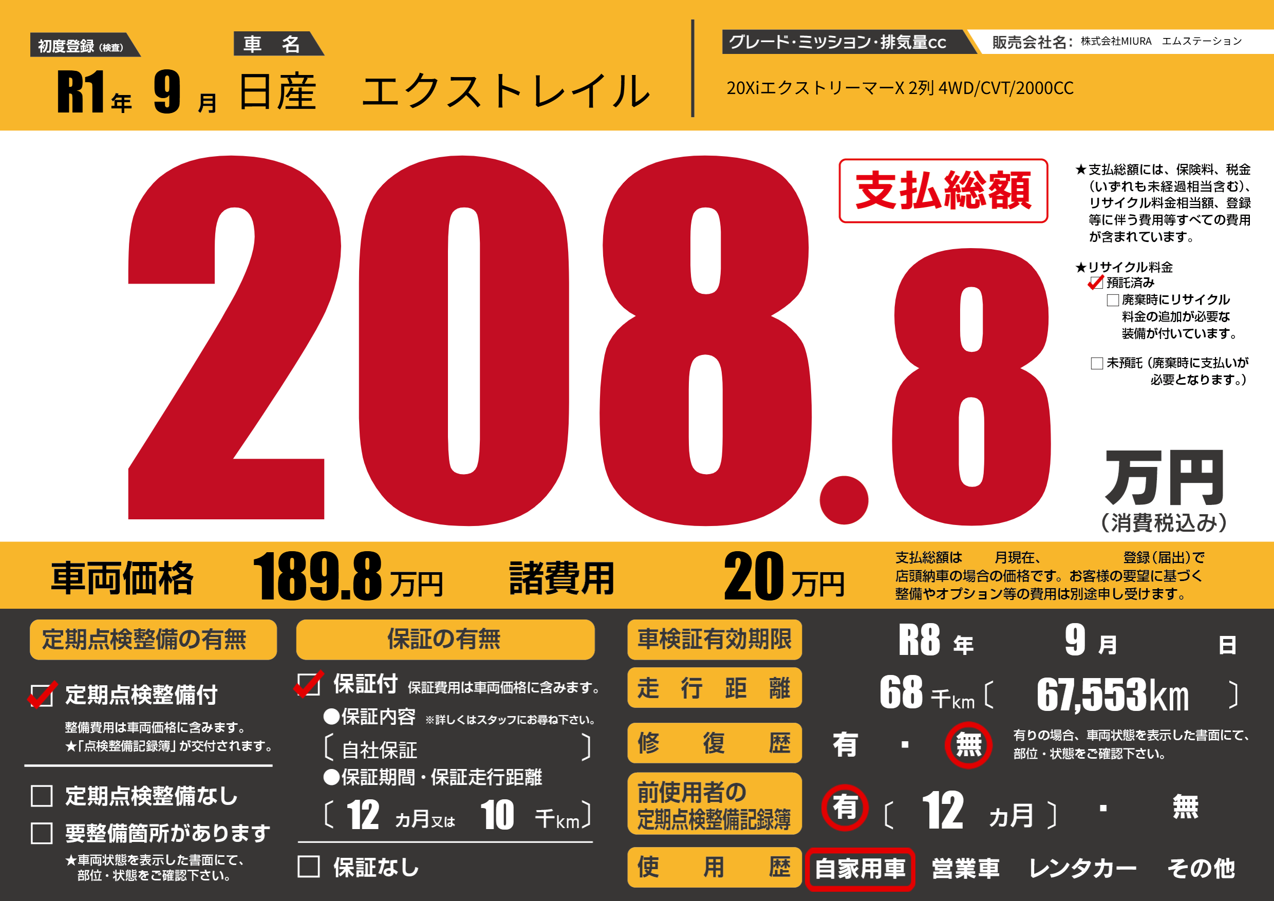 | 走行キロ | 6.8万km | 初年度登録 | R1年9月 |