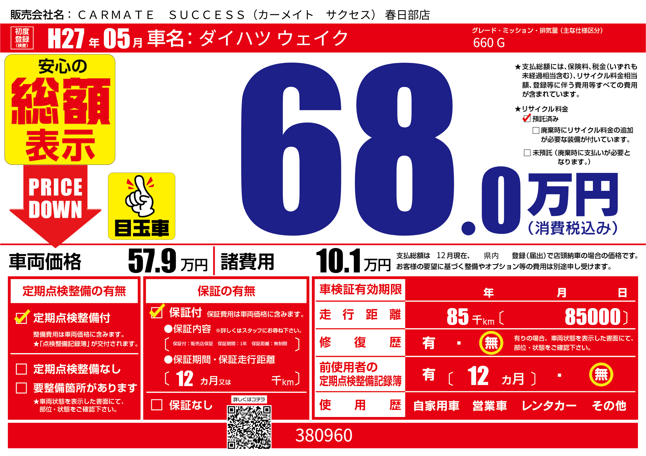| 走行キロ | 8.5万km | 初年度登録 | H27年05月 |