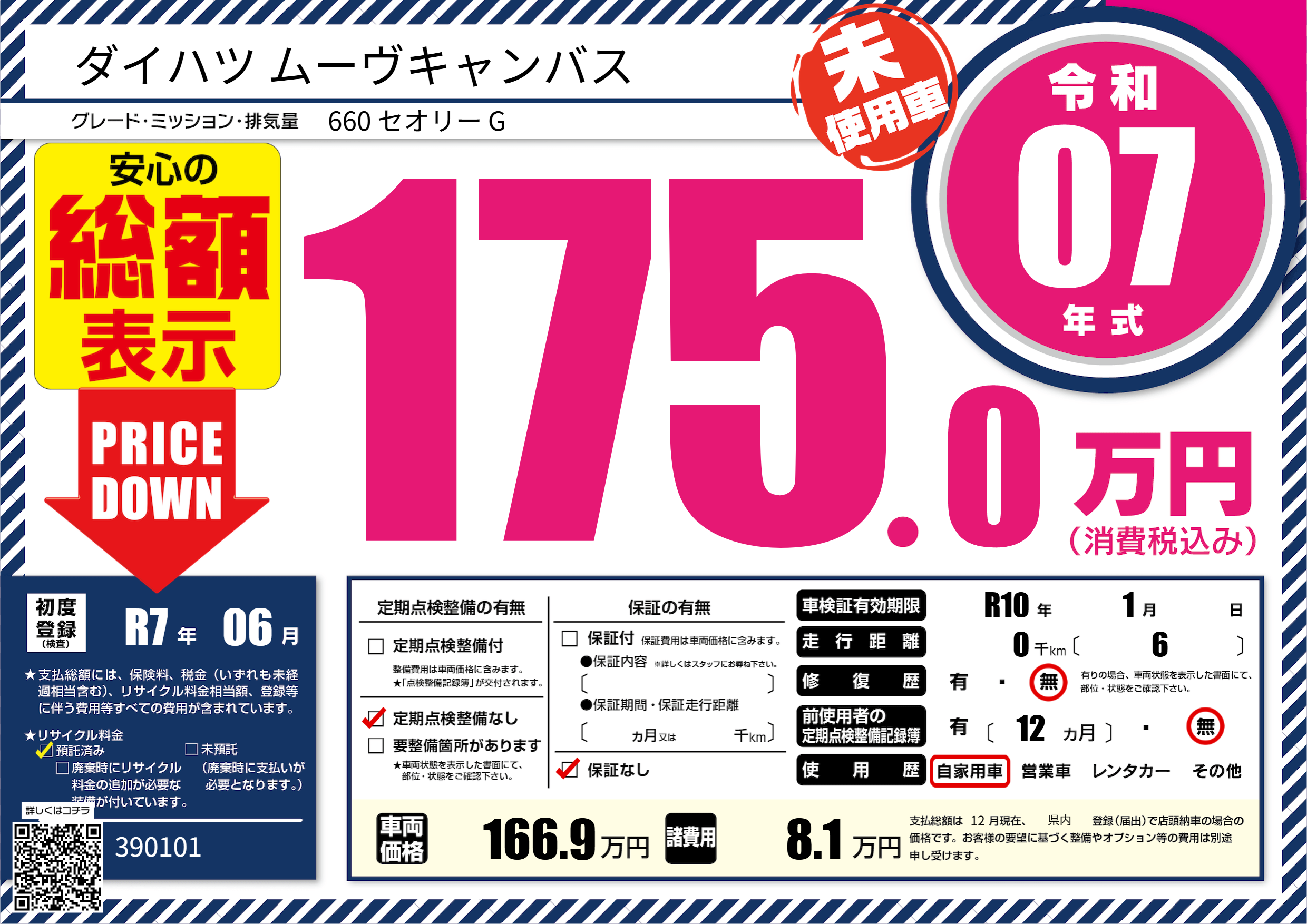 | 走行キロ | - | 初年度登録 | R7年06月 |