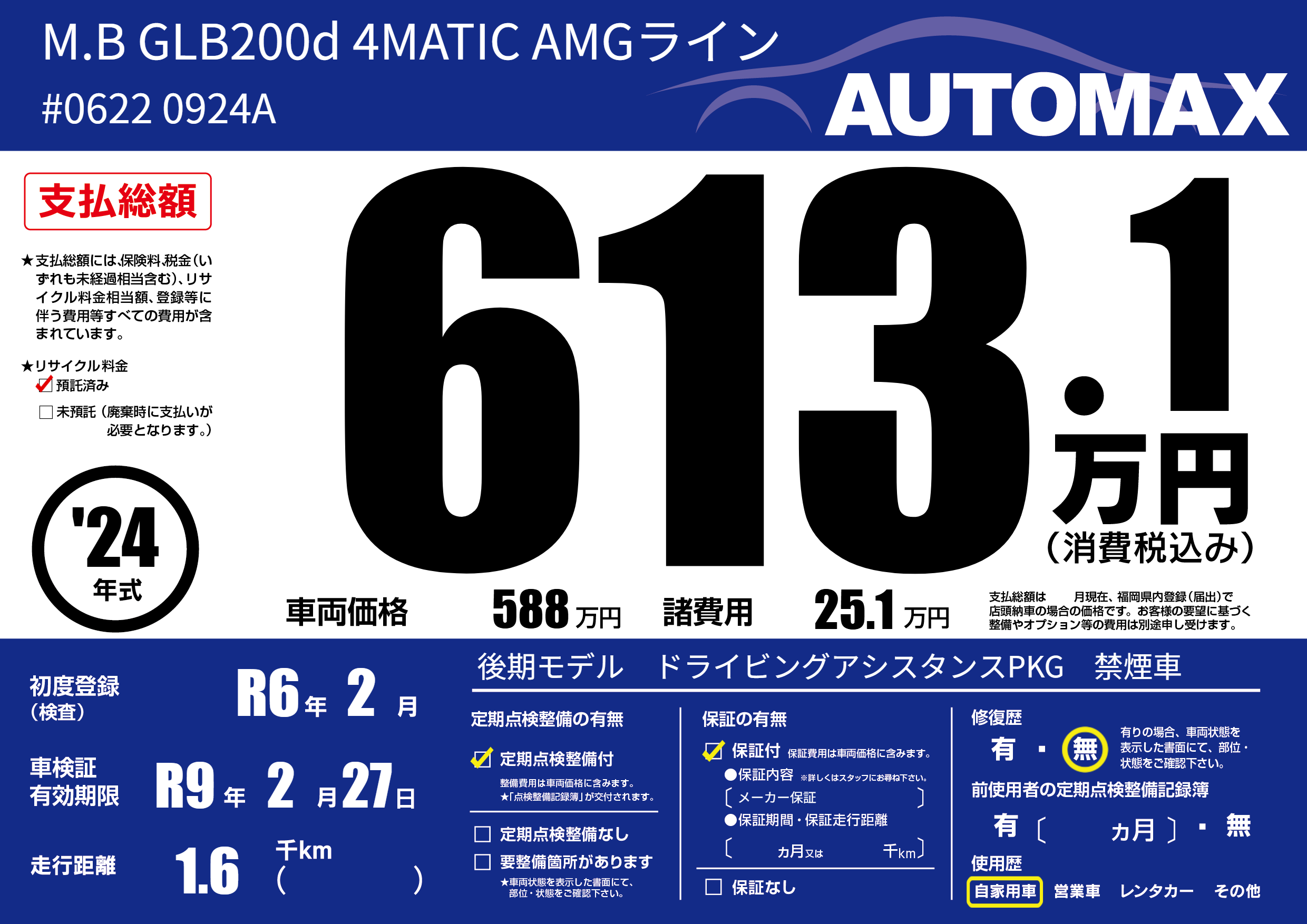 | 走行キロ | 0.1万km | 初年度登録 | R6年2月 |