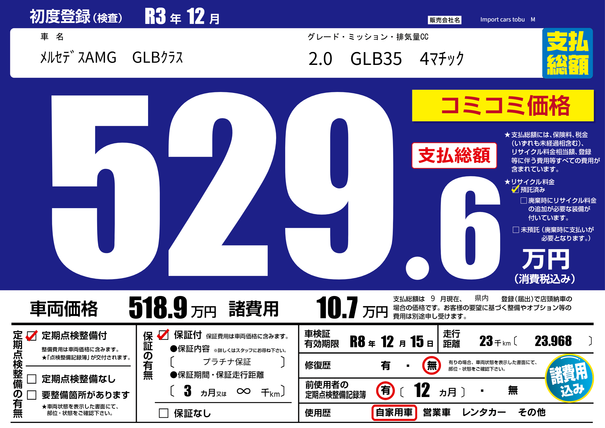 保証付き 保証内容( プラチナ保証) 3ヶ月または(∞)千kmまで |