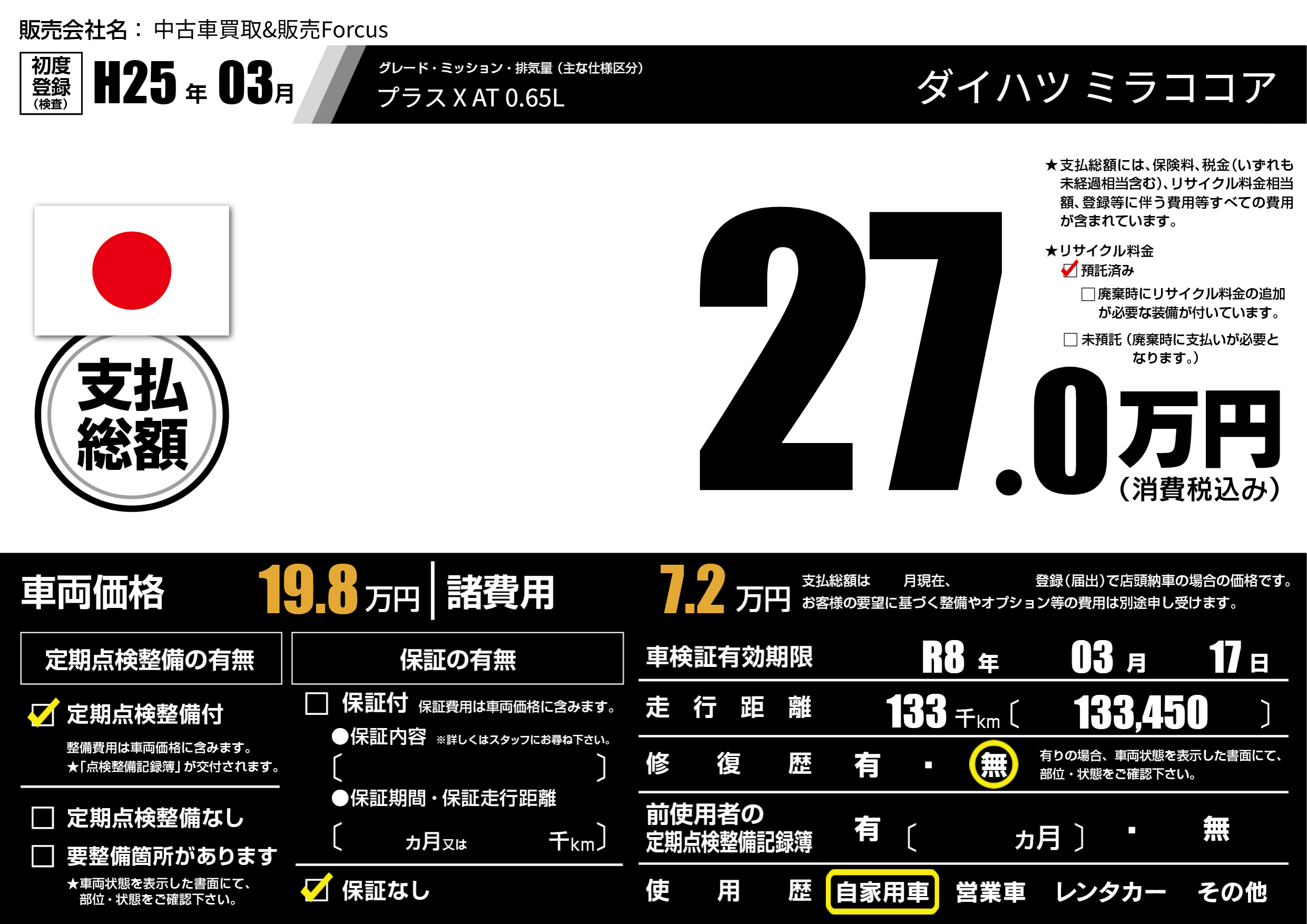 | 走行キロ | 13.3万km | 初年度登録 | H25年03月 |