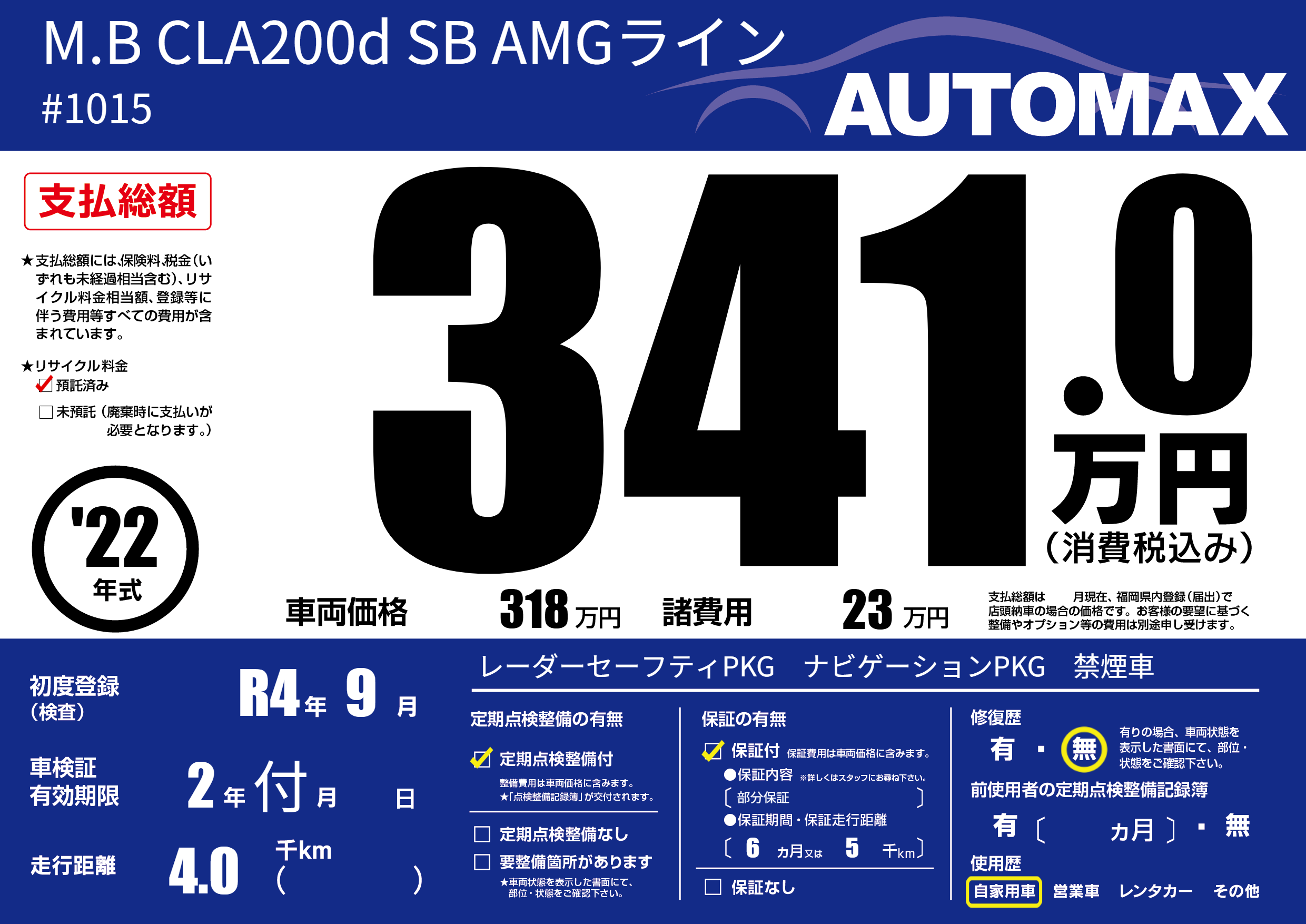 | 車名 | M.B CLA200d SB AMGライン | グレード ミッション 排気量 |