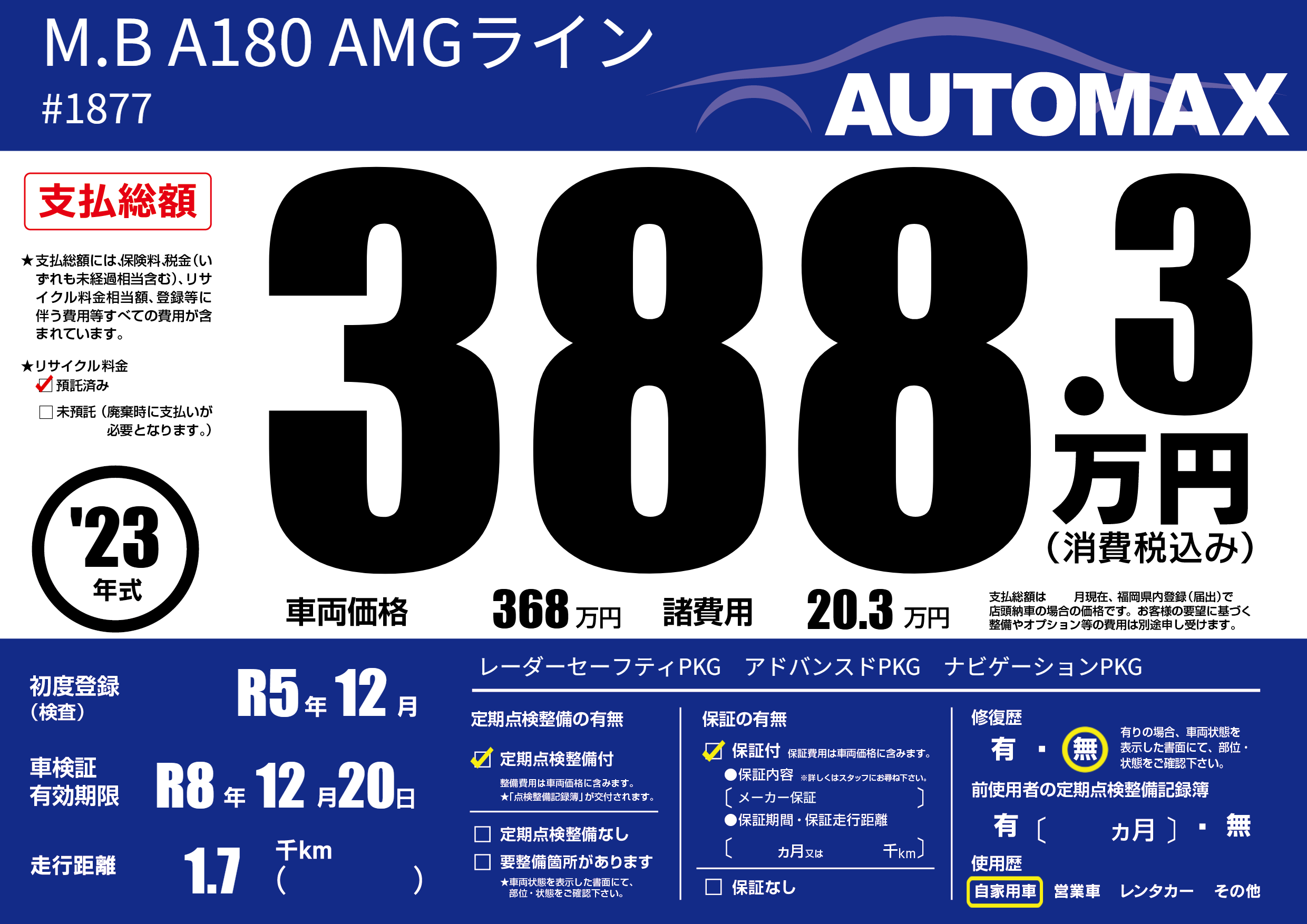 | 車名 | M.B A180 AMGライン | グレード ミッション 排気量 |