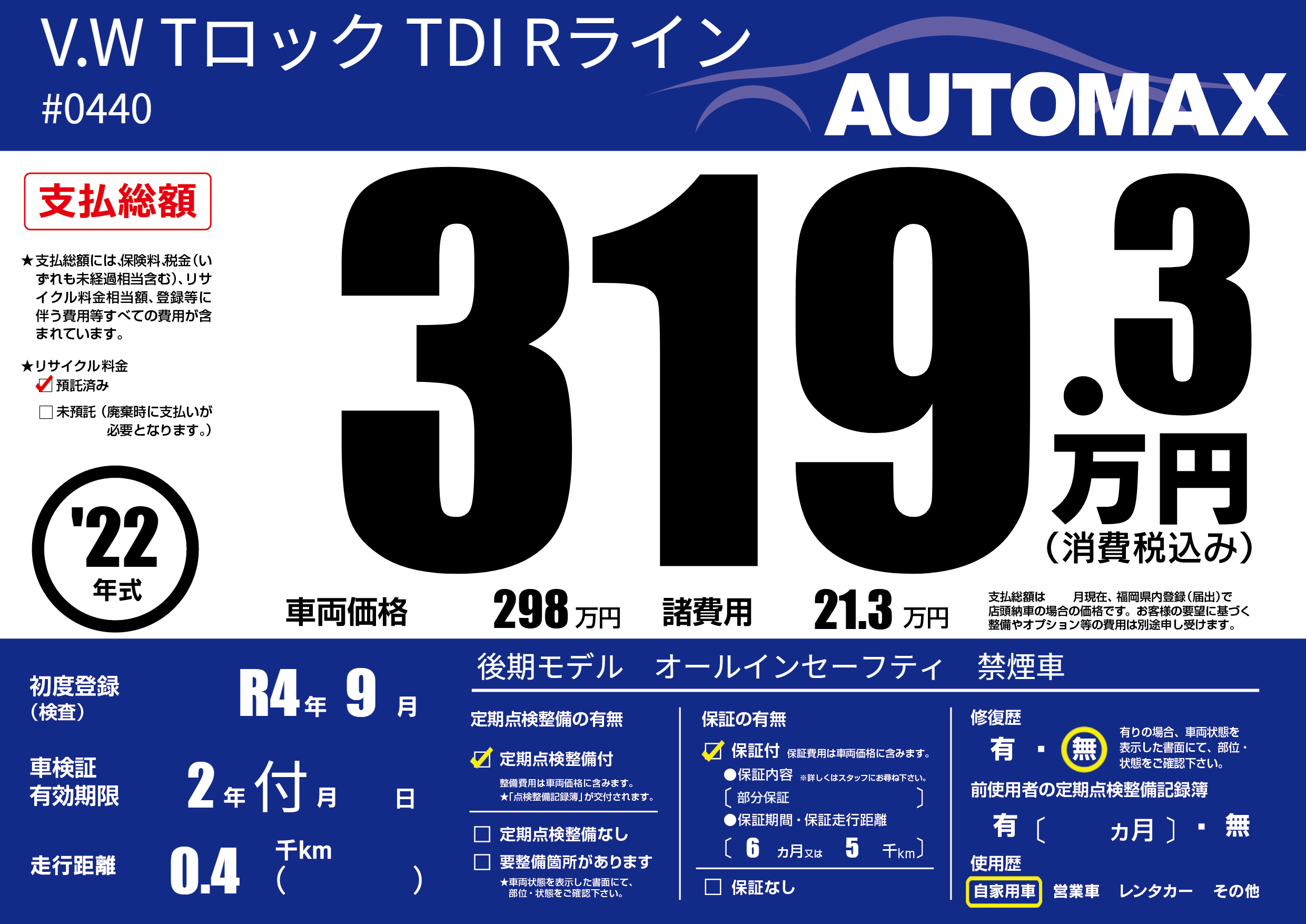 | 車名 | V.W Tロック TDI Rライン | グレード ミッション 排気量 |