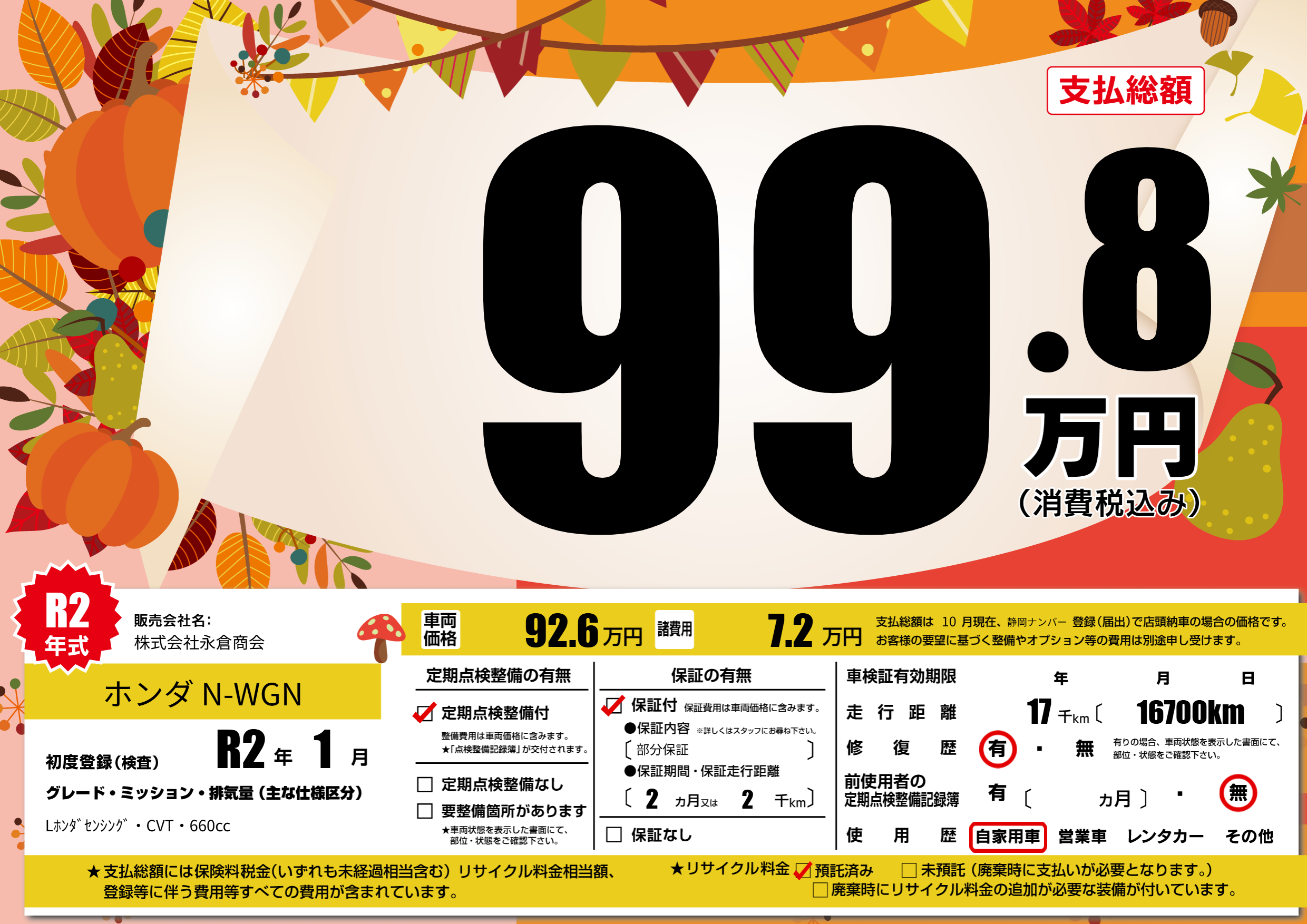 | 車名 | ホンダ N-WGN | グレード ミッション 排気量 |