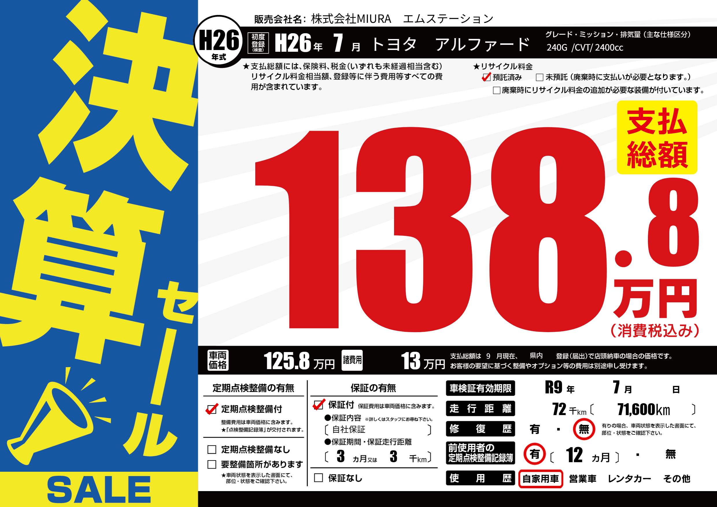 | 車検制限 | R9年 7月 - 日 | ||