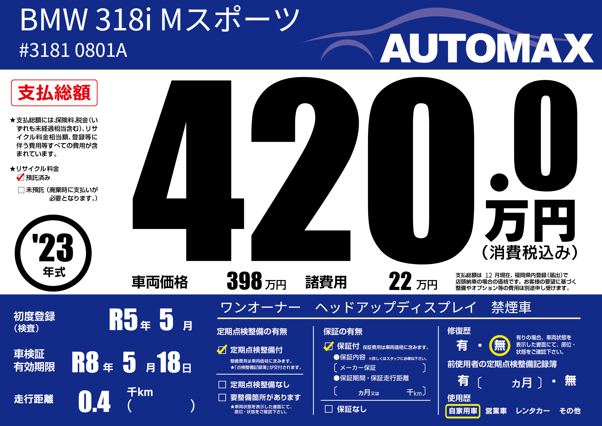 | 車名 | BMW 318i Mスポーツ | グレード ミッション 排気量 |