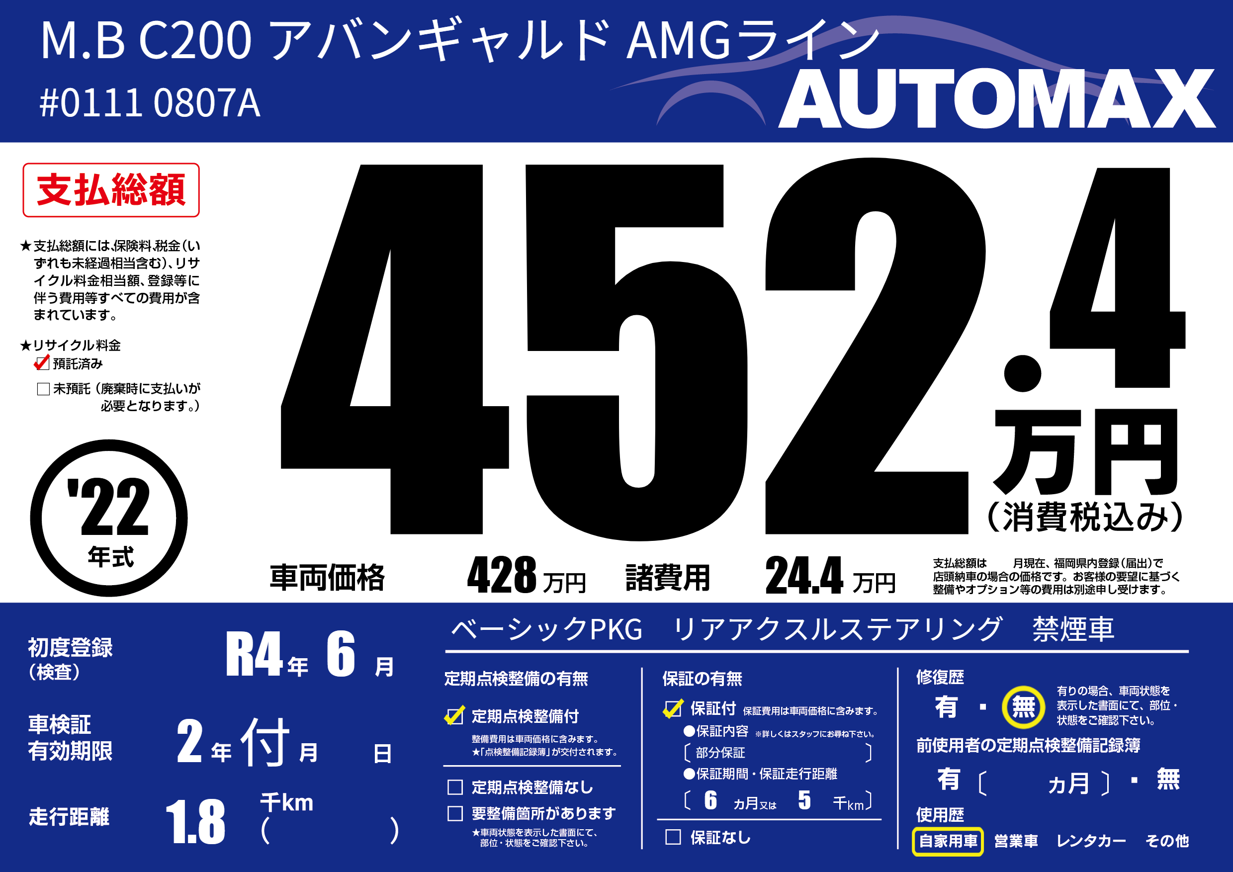 | 車名 | M.B C200 アバンギャルド AMGライン | グレード ミッション 排気量 |