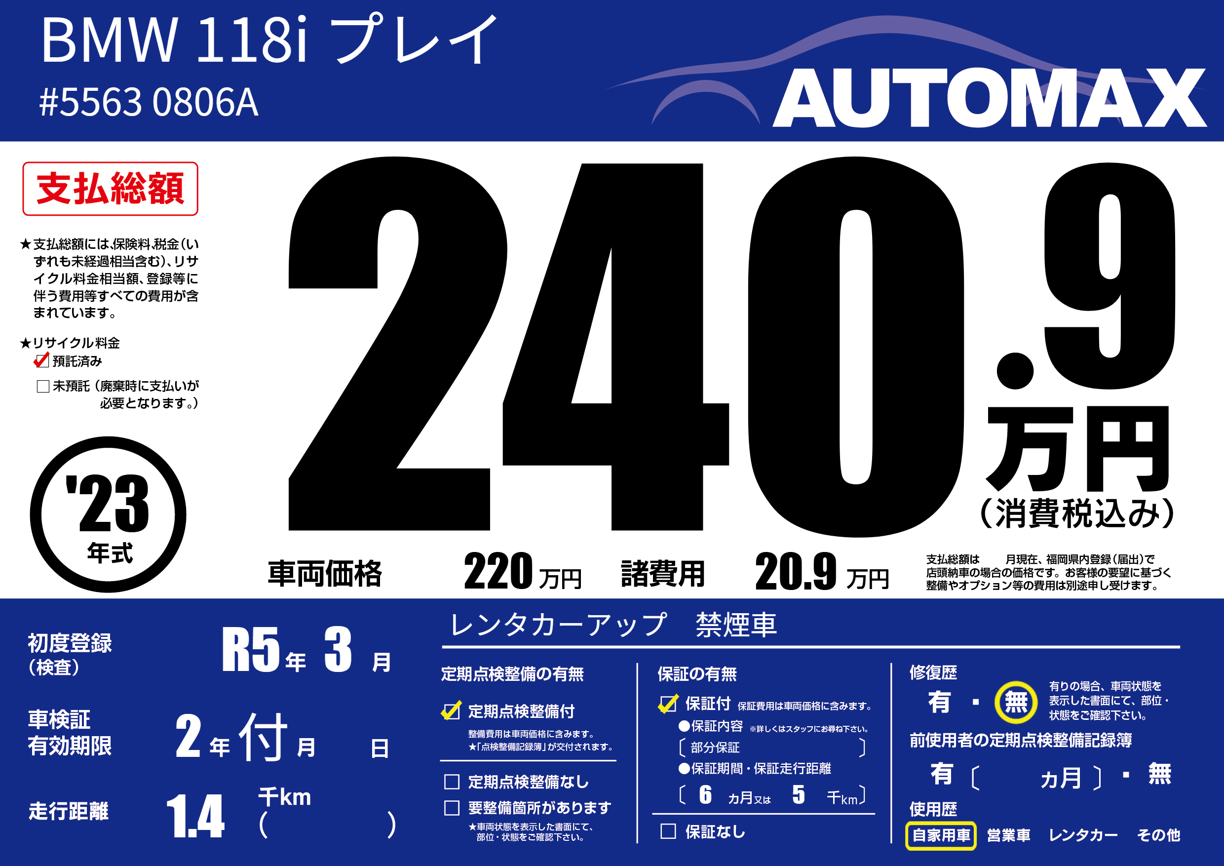 | 車名 | BMW 118i プレイ | グレード ミッション 排気量 |
