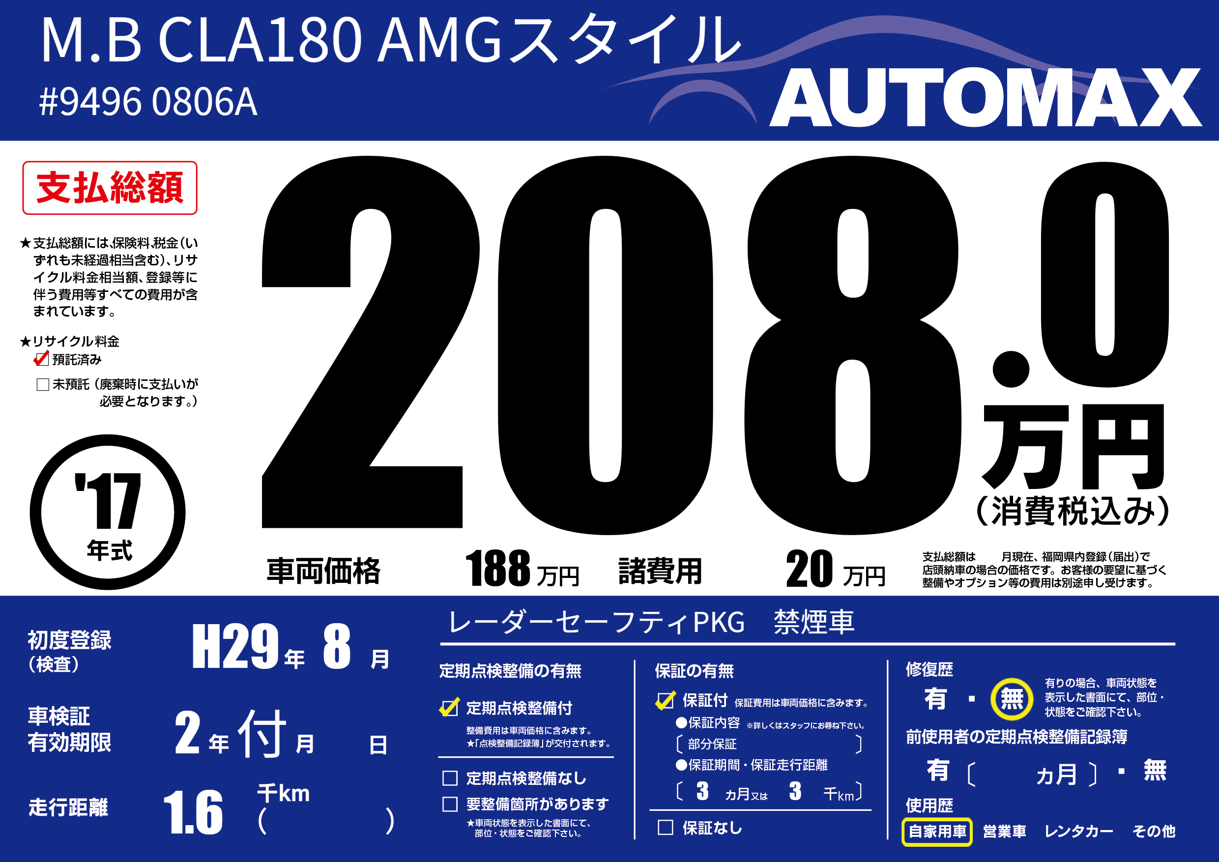 | 車名 | M.B CLA180 AMGスタイル | グレード ミッション 排気量 |