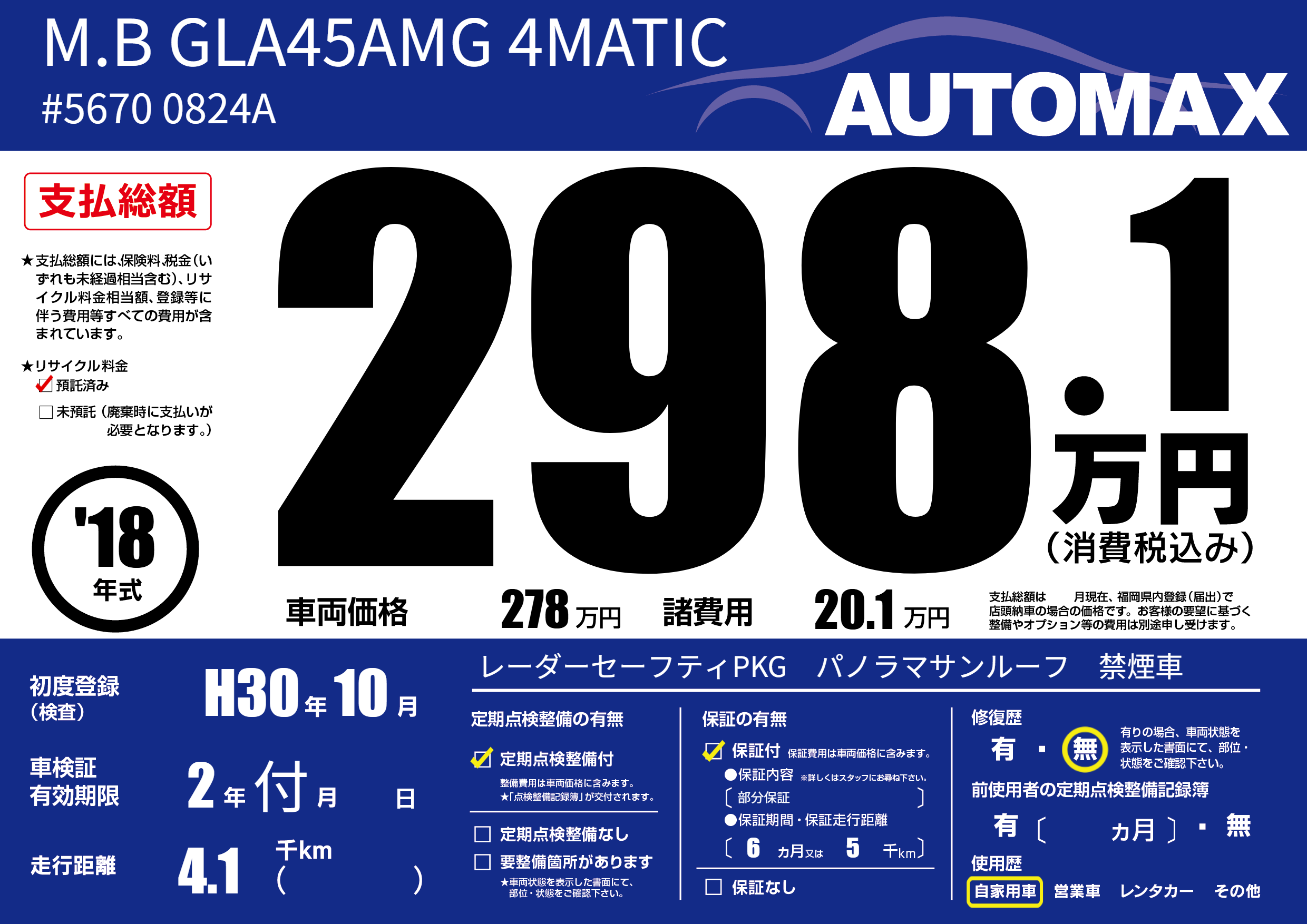 | 車名 | M.B GLA45AMG 4MATIC | グレード ミッション 排気量 |