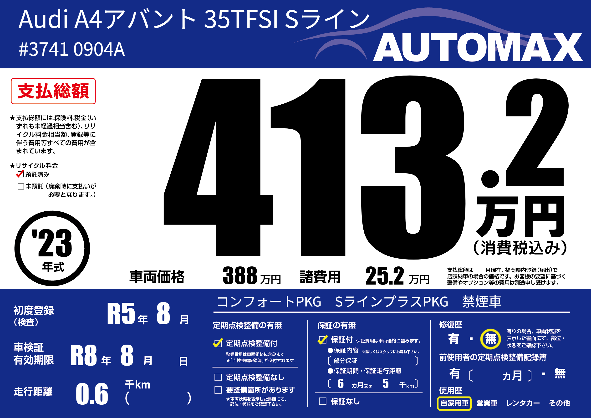 | 車名 | Audi A4アバント 35TFSI Sライン | グレード ミッション 排気量 |