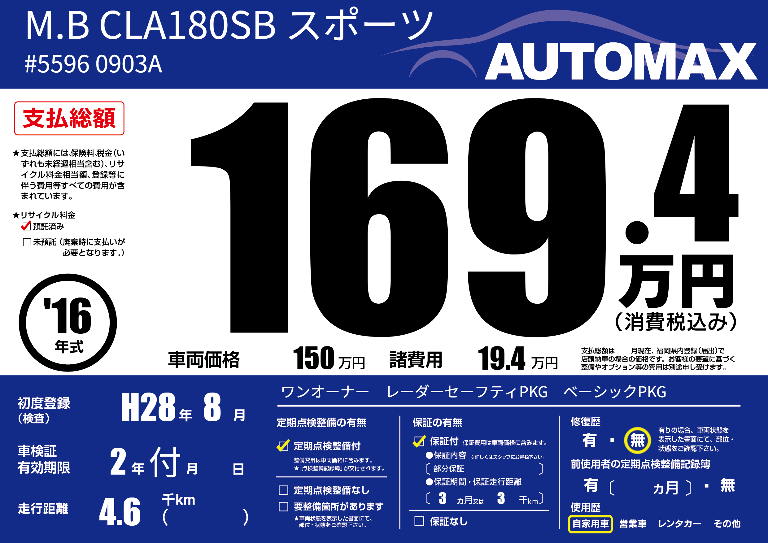 | 車名 | M.B CLA180SB スポーツ | グレード ミッション 排気量 |