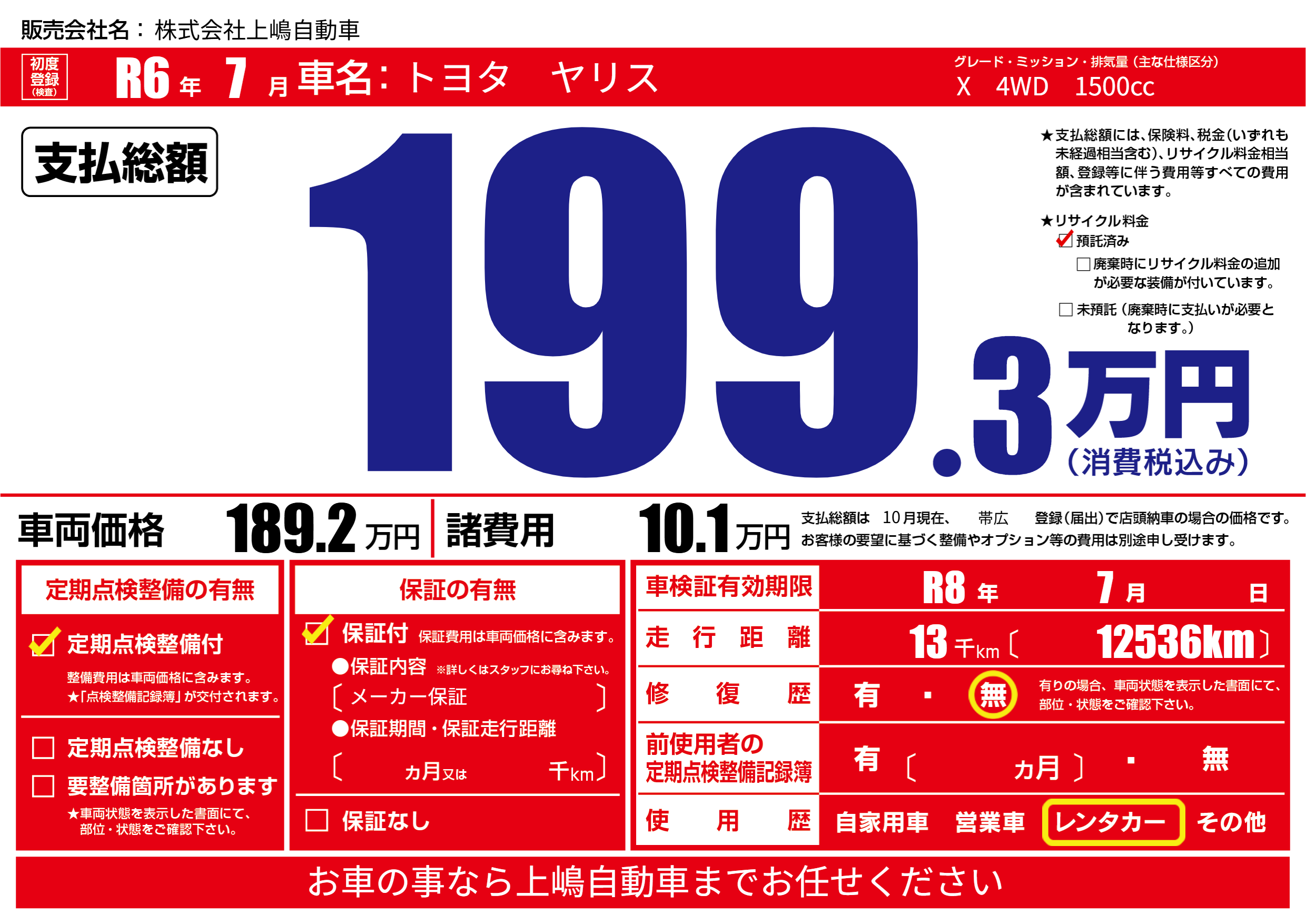 | 車名 | トヨタ ヤリス | グレード ミッション 排気量 |