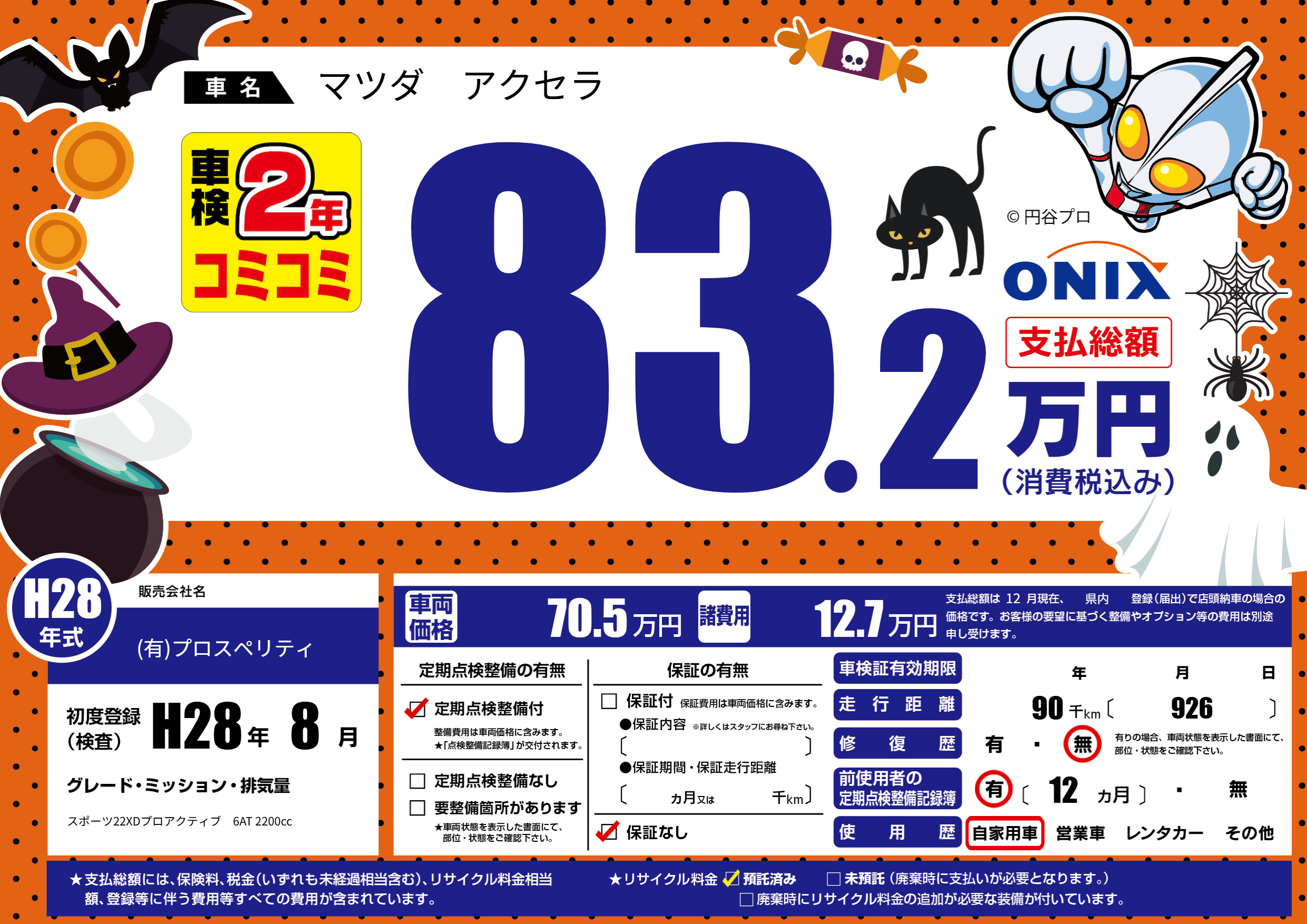 | 走行キロ | 9万km | 初年度登録 | H28年8月 |