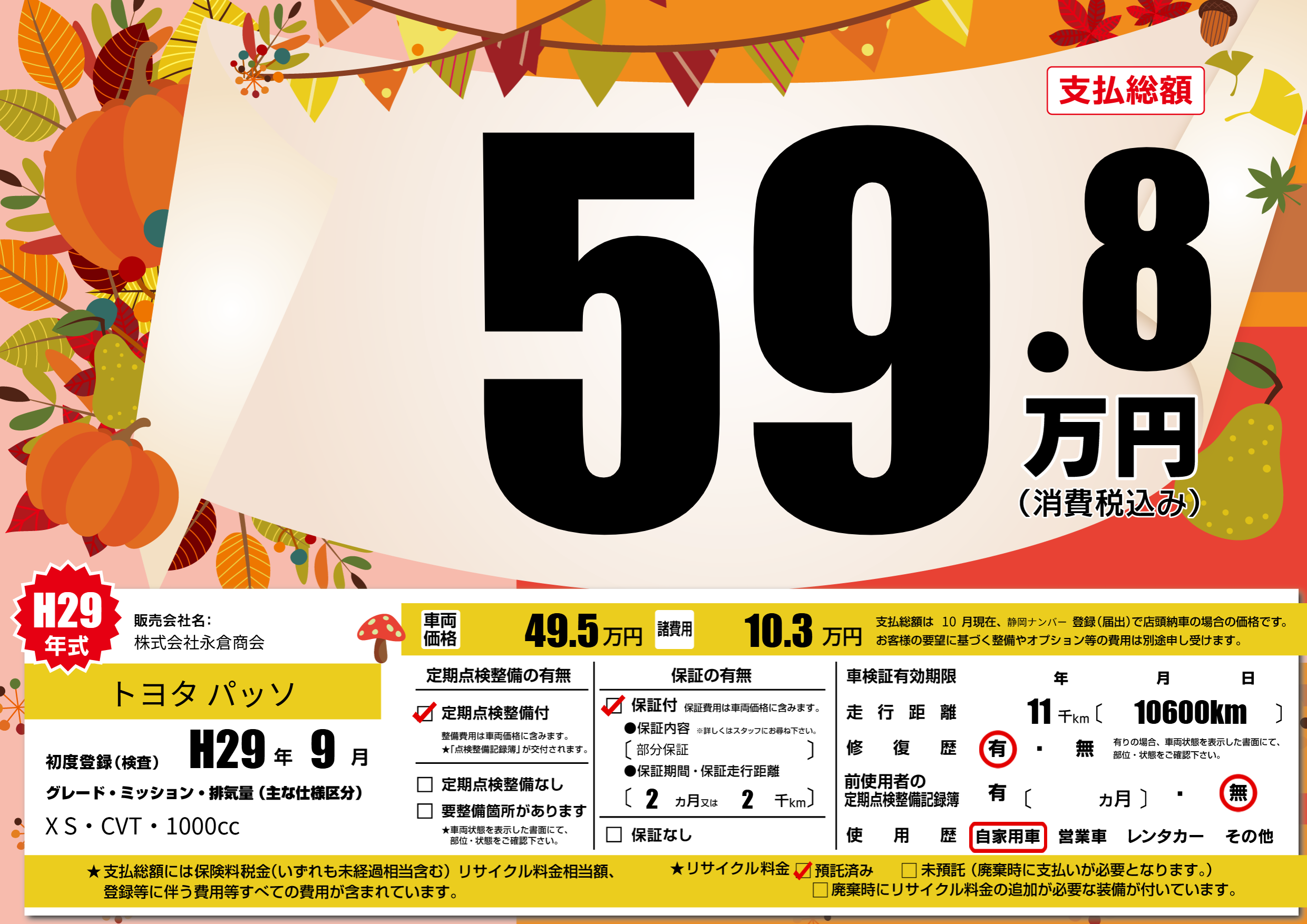 | 車名 | トヨタ パッソ | グレード ミッション 排気量 |