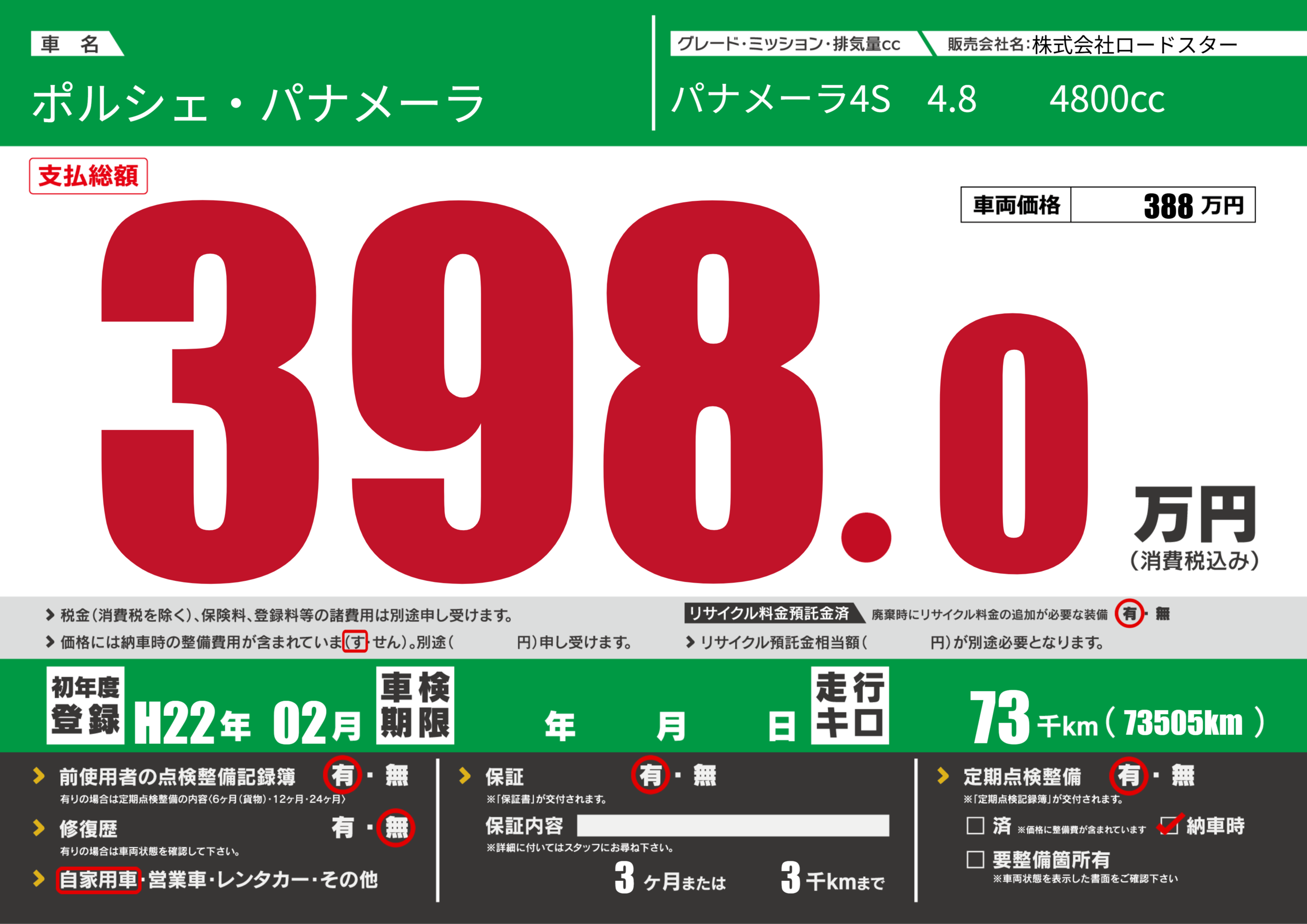 | 車名 | ポルシェ・パナメーラ | グレード ミッション 排気量 |