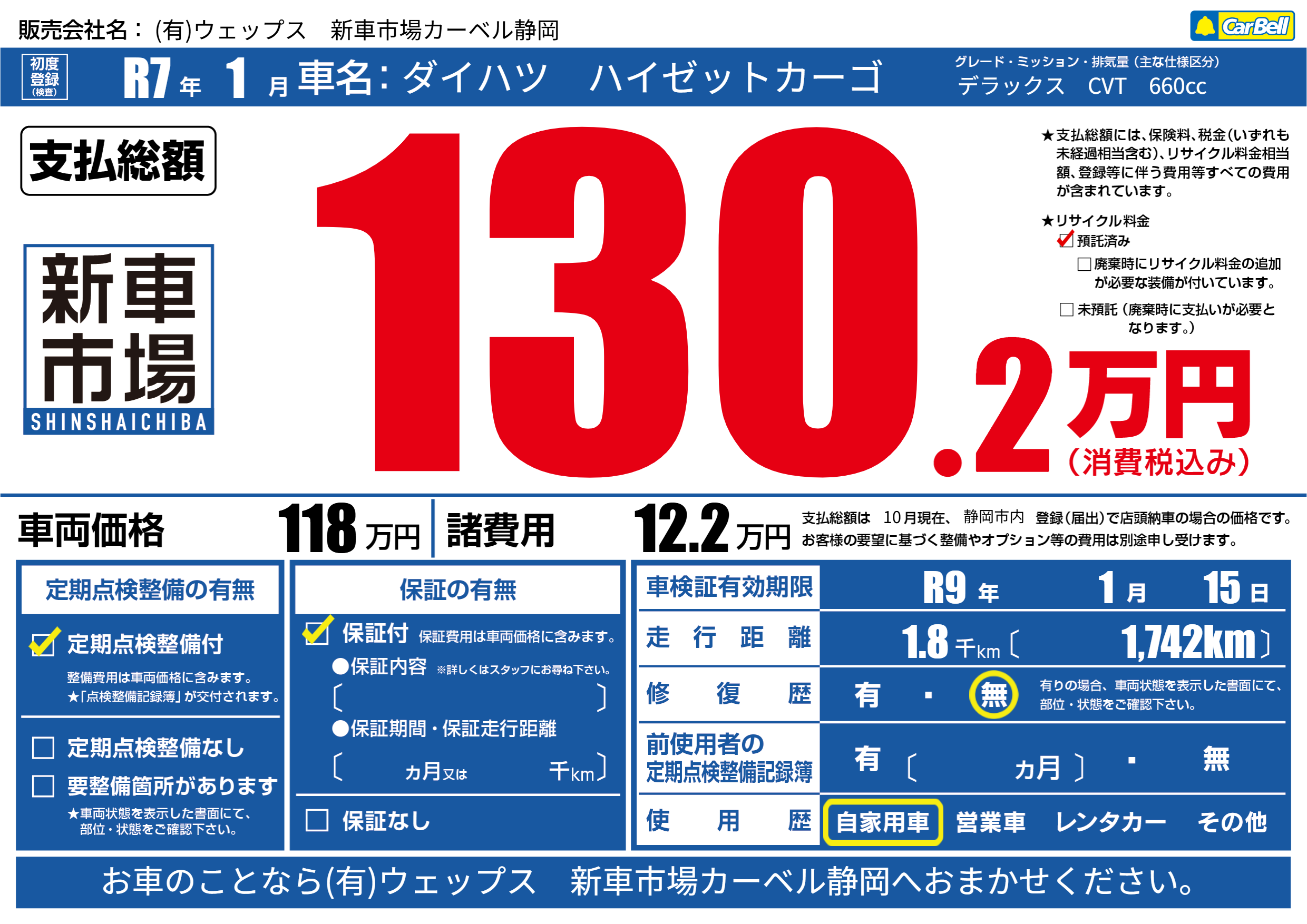 | 車名 | ダイハツ ハイゼットカーゴ | グレード ミッション 排気量 |